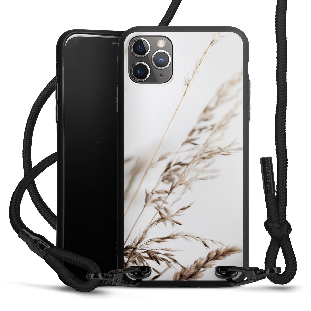 The matt black silicone case is made of flexible TPU (thermoplastic polyurethane) and offers robust protection. The durable, unbreakable material makes the cover flexible and dimensionally stable at the same time. The matte surface makes your design stand out more and is less susceptible to fingerprints and dirt. The stylish trend accessory fits comfortably in the hand and is perfectly complemented by the fabric (polyester) mobile phone strap. The braided fabric strap is approx. 1.70 metres long with a diameter of approx. 0.5 cm. Due to the special knotting technique, the length of the strap can be adjusted by simply pulling it, so that you can adapt it individually to your wishes. The practical case to wear around your neck is available with the fabric strap in black. As a little icing on the cake, we have provided the strap with a chic metal fastener in matt black. The strap is securely fastened to the case with loops made of high-quality genuine leather and press studs. The ends of the fabric strap are covered with metallic end caps and thus protected from fraying.