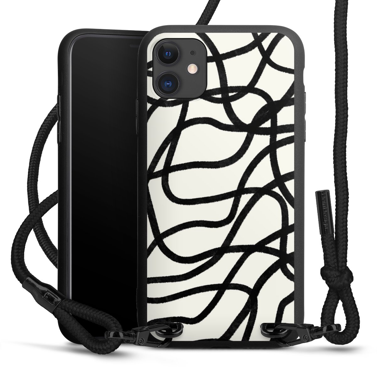 The matt black silicone case is made of flexible TPU (thermoplastic polyurethane) and offers robust protection. The durable, unbreakable material makes the cover flexible and dimensionally stable at the same time. The matte surface makes your design stand out more and is less susceptible to fingerprints and dirt. The stylish trend accessory fits comfortably in the hand and is perfectly complemented by the fabric (polyester) mobile phone strap. The braided fabric strap is approx. 1.70 metres long with a diameter of approx. 0.5 cm. Due to the special knotting technique, the length of the strap can be adjusted by simply pulling it, so that you can adapt it individually to your wishes. The practical case to wear around your neck is available with the fabric strap in black. As a little icing on the cake, we have provided the strap with a chic metal fastener in matt black. The strap is securely fastened to the case with loops made of high-quality genuine leather and press studs. The ends of the fabric strap are covered with metallic end caps and thus protected from fraying.
