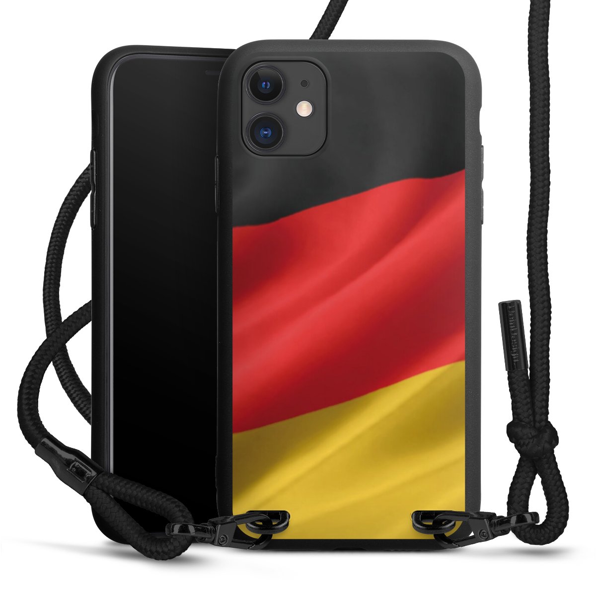 The matt black silicone case is made of flexible TPU (thermoplastic polyurethane) and offers robust protection. The durable, unbreakable material makes the cover flexible and dimensionally stable at the same time. The matte surface makes your design stand out more and is less susceptible to fingerprints and dirt. The stylish trend accessory fits comfortably in the hand and is perfectly complemented by the fabric (polyester) mobile phone strap. The braided fabric strap is approx. 1.70 metres long with a diameter of approx. 0.5 cm. Due to the special knotting technique, the length of the strap can be adjusted by simply pulling it, so that you can adapt it individually to your wishes. The practical case to wear around your neck is available with the fabric strap in black. As a little icing on the cake, we have provided the strap with a chic metal fastener in matt black. The strap is securely fastened to the case with loops made of high-quality genuine leather and press studs. The ends of the fabric strap are covered with metallic end caps and thus protected from fraying.