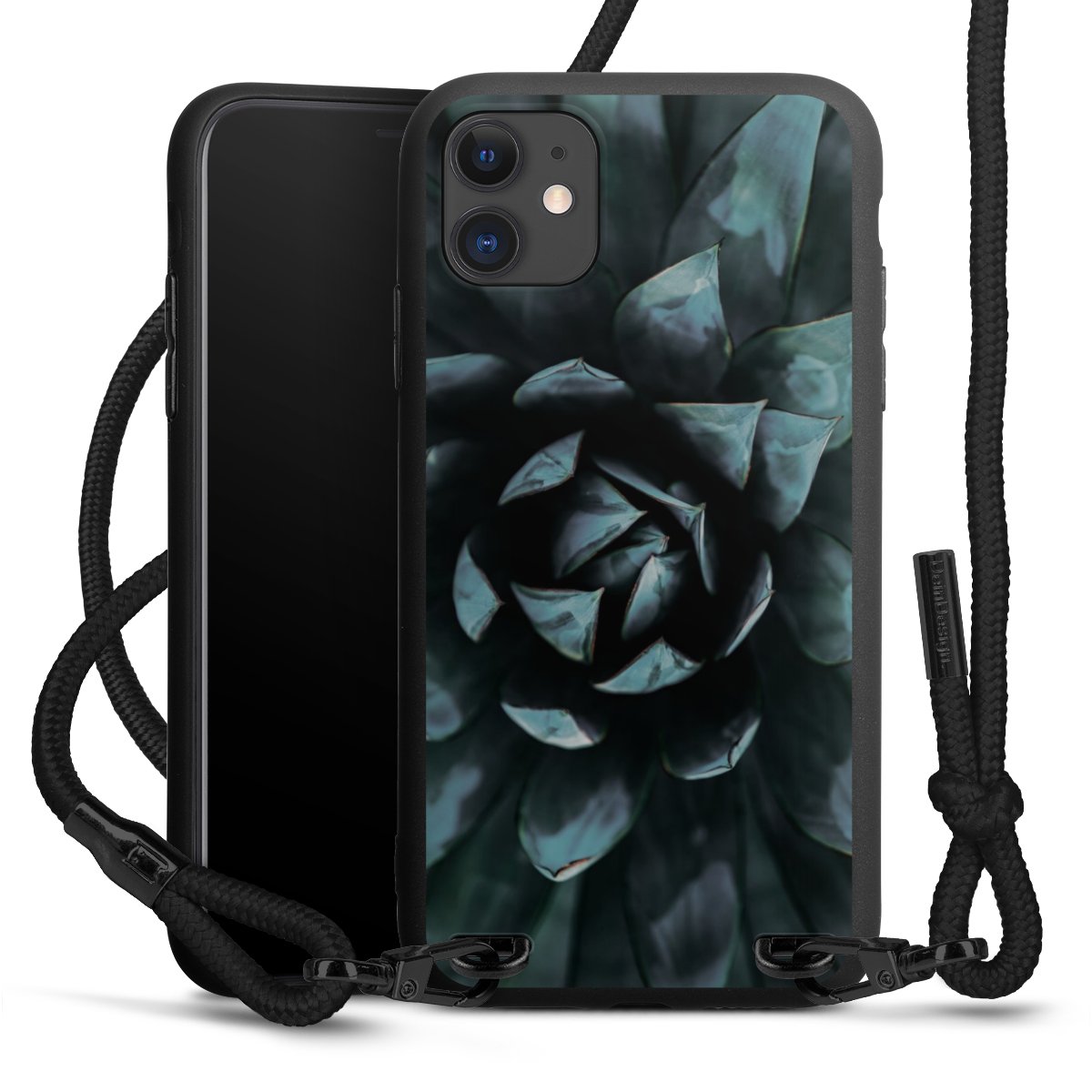 The matt black silicone case is made of flexible TPU (thermoplastic polyurethane) and offers robust protection. The durable, unbreakable material makes the cover flexible and dimensionally stable at the same time. The matte surface makes your design stand out more and is less susceptible to fingerprints and dirt. The stylish trend accessory fits comfortably in the hand and is perfectly complemented by the fabric (polyester) mobile phone strap. The braided fabric strap is approx. 1.70 metres long with a diameter of approx. 0.5 cm. Due to the special knotting technique, the length of the strap can be adjusted by simply pulling it, so that you can adapt it individually to your wishes. The practical case to wear around your neck is available with the fabric strap in black. As a little icing on the cake, we have provided the strap with a chic metal fastener in matt black. The strap is securely fastened to the case with loops made of high-quality genuine leather and press studs. The ends of the fabric strap are covered with metallic end caps and thus protected from fraying.