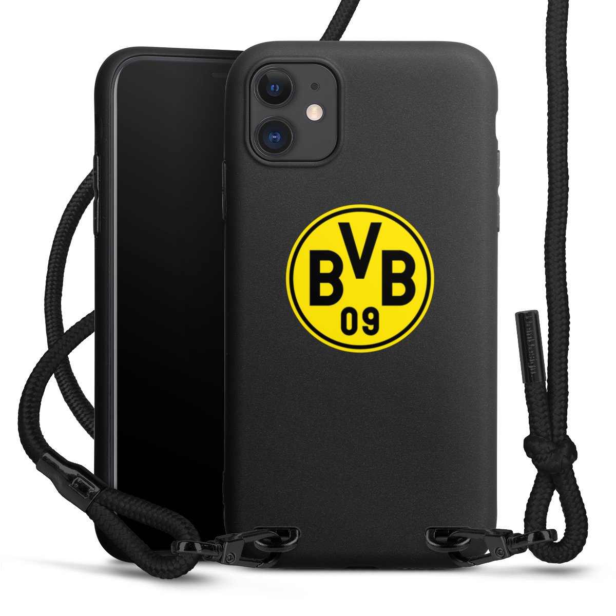 The matt black silicone case is made of flexible TPU (thermoplastic polyurethane) and offers robust protection. The durable, unbreakable material makes the cover flexible and dimensionally stable at the same time. The matte surface makes your design stand out more and is less susceptible to fingerprints and dirt. The stylish trend accessory fits comfortably in the hand and is perfectly complemented by the fabric (polyester) mobile phone strap. The braided fabric strap is approx. 1.70 metres long with a diameter of approx. 0.5 cm. Due to the special knotting technique, the length of the strap can be adjusted by simply pulling it, so that you can adapt it individually to your wishes. The practical case to wear around your neck is available with the fabric strap in black. As a little icing on the cake, we have provided the strap with a chic metal fastener in matt black. The strap is securely fastened to the case with loops made of high-quality genuine leather and press studs. The ends of the fabric strap are covered with metallic end caps and thus protected from fraying.