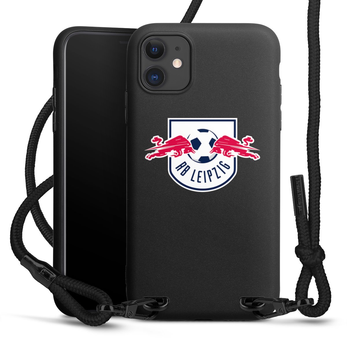 The matt black silicone case is made of flexible TPU (thermoplastic polyurethane) and offers robust protection. The durable, unbreakable material makes the cover flexible and dimensionally stable at the same time. The matte surface makes your design stand out more and is less susceptible to fingerprints and dirt. The stylish trend accessory fits comfortably in the hand and is perfectly complemented by the fabric (polyester) mobile phone strap. The braided fabric strap is approx. 1.70 metres long with a diameter of approx. 0.5 cm. Due to the special knotting technique, the length of the strap can be adjusted by simply pulling it, so that you can adapt it individually to your wishes. The practical case to wear around your neck is available with the fabric strap in black. As a little icing on the cake, we have provided the strap with a chic metal fastener in matt black. The strap is securely fastened to the case with loops made of high-quality genuine leather and press studs. The ends of the fabric strap are covered with metallic end caps and thus protected from fraying.