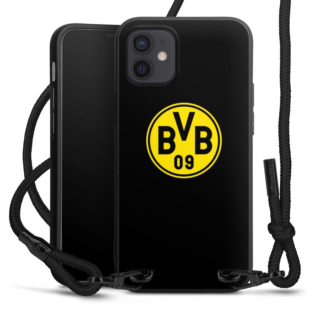 The matt black silicone case is made of flexible TPU (thermoplastic polyurethane) and offers robust protection. The durable, unbreakable material makes the cover flexible and dimensionally stable at the same time. The matte surface makes your design stand out more and is less susceptible to fingerprints and dirt. The stylish trend accessory fits comfortably in the hand and is perfectly complemented by the fabric (polyester) mobile phone strap. The braided fabric strap is approx. 1.70 metres long with a diameter of approx. 0.5 cm. Due to the special knotting technique, the length of the strap can be adjusted by simply pulling it, so that you can adapt it individually to your wishes. The practical case to wear around your neck is available with the fabric strap in black. As a little icing on the cake, we have provided the strap with a chic metal fastener in matt black. The strap is securely fastened to the case with loops made of high-quality genuine leather and press studs. The ends of the fabric strap are covered with metallic end caps and thus protected from fraying.