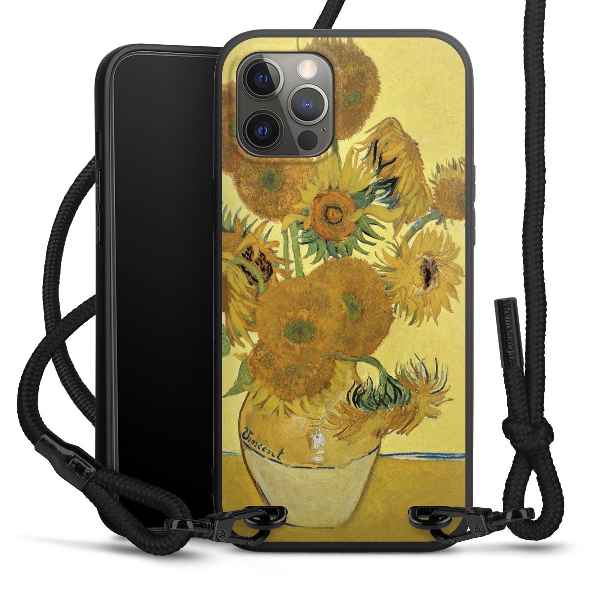 The matt black silicone case is made of flexible TPU (thermoplastic polyurethane) and offers robust protection. The durable, unbreakable material makes the cover flexible and dimensionally stable at the same time. The matte surface makes your design stand out more and is less susceptible to fingerprints and dirt. The stylish trend accessory fits comfortably in the hand and is perfectly complemented by the fabric (polyester) mobile phone strap. The braided fabric strap is approx. 1.70 metres long with a diameter of approx. 0.5 cm. Due to the special knotting technique, the length of the strap can be adjusted by simply pulling it, so that you can adapt it individually to your wishes. The practical case to wear around your neck is available with the fabric strap in black. As a little icing on the cake, we have provided the strap with a chic metal fastener in matt black. The strap is securely fastened to the case with loops made of high-quality genuine leather and press studs. The ends of the fabric strap are covered with metallic end caps and thus protected from fraying.