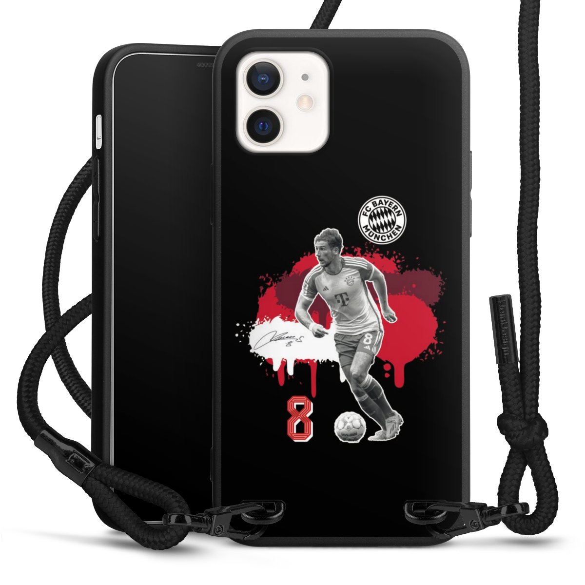The matt black silicone case is made of flexible TPU (thermoplastic polyurethane) and offers robust protection. The durable, unbreakable material makes the cover flexible and dimensionally stable at the same time. The matte surface makes your design stand out more and is less susceptible to fingerprints and dirt. The stylish trend accessory fits comfortably in the hand and is perfectly complemented by the fabric (polyester) mobile phone strap. The braided fabric strap is approx. 1.70 metres long with a diameter of approx. 0.5 cm. Due to the special knotting technique, the length of the strap can be adjusted by simply pulling it, so that you can adapt it individually to your wishes. The practical case to wear around your neck is available with the fabric strap in black. As a little icing on the cake, we have provided the strap with a chic metal fastener in matt black. The strap is securely fastened to the case with loops made of high-quality genuine leather and press studs. The ends of the fabric strap are covered with metallic end caps and thus protected from fraying.