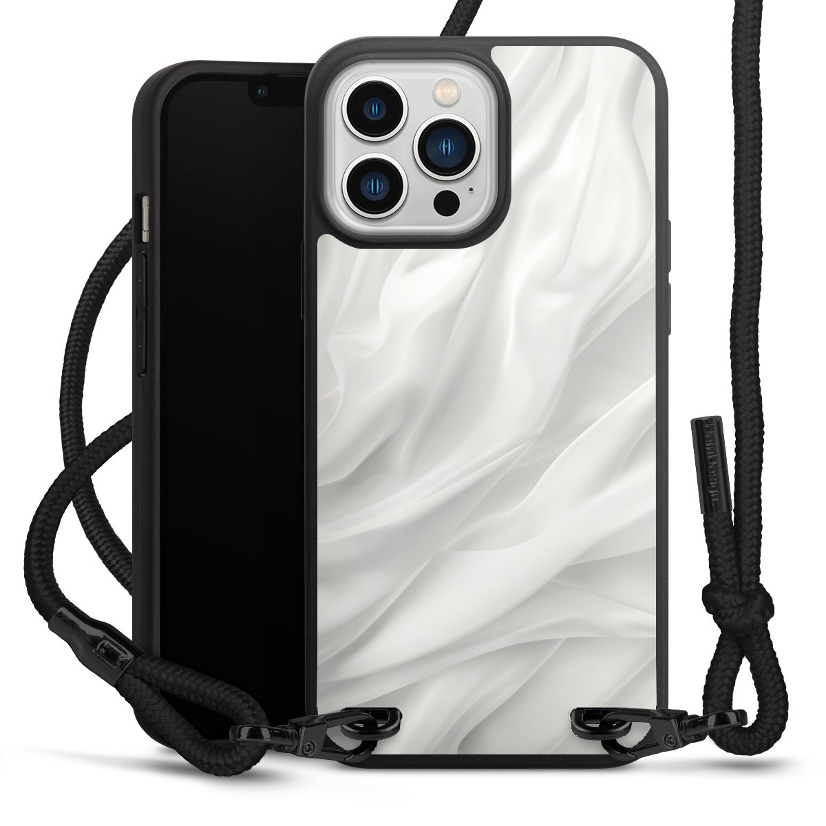 The matt black silicone case is made of flexible TPU (thermoplastic polyurethane) and offers robust protection. The durable, unbreakable material makes the cover flexible and dimensionally stable at the same time. The matte surface makes your design stand out more and is less susceptible to fingerprints and dirt. The stylish trend accessory fits comfortably in the hand and is perfectly complemented by the fabric (polyester) mobile phone strap. The braided fabric strap is approx. 1.70 metres long with a diameter of approx. 0.5 cm. Due to the special knotting technique, the length of the strap can be adjusted by simply pulling it, so that you can adapt it individually to your wishes. The practical case to wear around your neck is available with the fabric strap in black. As a little icing on the cake, we have provided the strap with a chic metal fastener in matt black. The strap is securely fastened to the case with loops made of high-quality genuine leather and press studs. The ends of the fabric strap are covered with metallic end caps and thus protected from fraying.