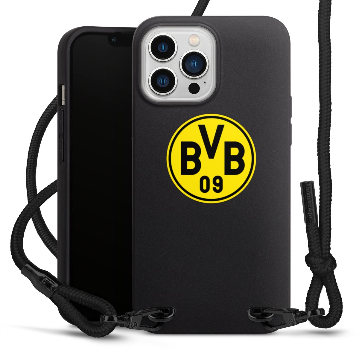 The matt black silicone case is made of flexible TPU (thermoplastic polyurethane) and offers robust protection. The durable, unbreakable material makes the cover flexible and dimensionally stable at the same time. The matte surface makes your design stand out more and is less susceptible to fingerprints and dirt. The stylish trend accessory fits comfortably in the hand and is perfectly complemented by the fabric (polyester) mobile phone strap. The braided fabric strap is approx. 1.70 metres long with a diameter of approx. 0.5 cm. Due to the special knotting technique, the length of the strap can be adjusted by simply pulling it, so that you can adapt it individually to your wishes. The practical case to wear around your neck is available with the fabric strap in black. As a little icing on the cake, we have provided the strap with a chic metal fastener in matt black. The strap is securely fastened to the case with loops made of high-quality genuine leather and press studs. The ends of the fabric strap are covered with metallic end caps and thus protected from fraying.