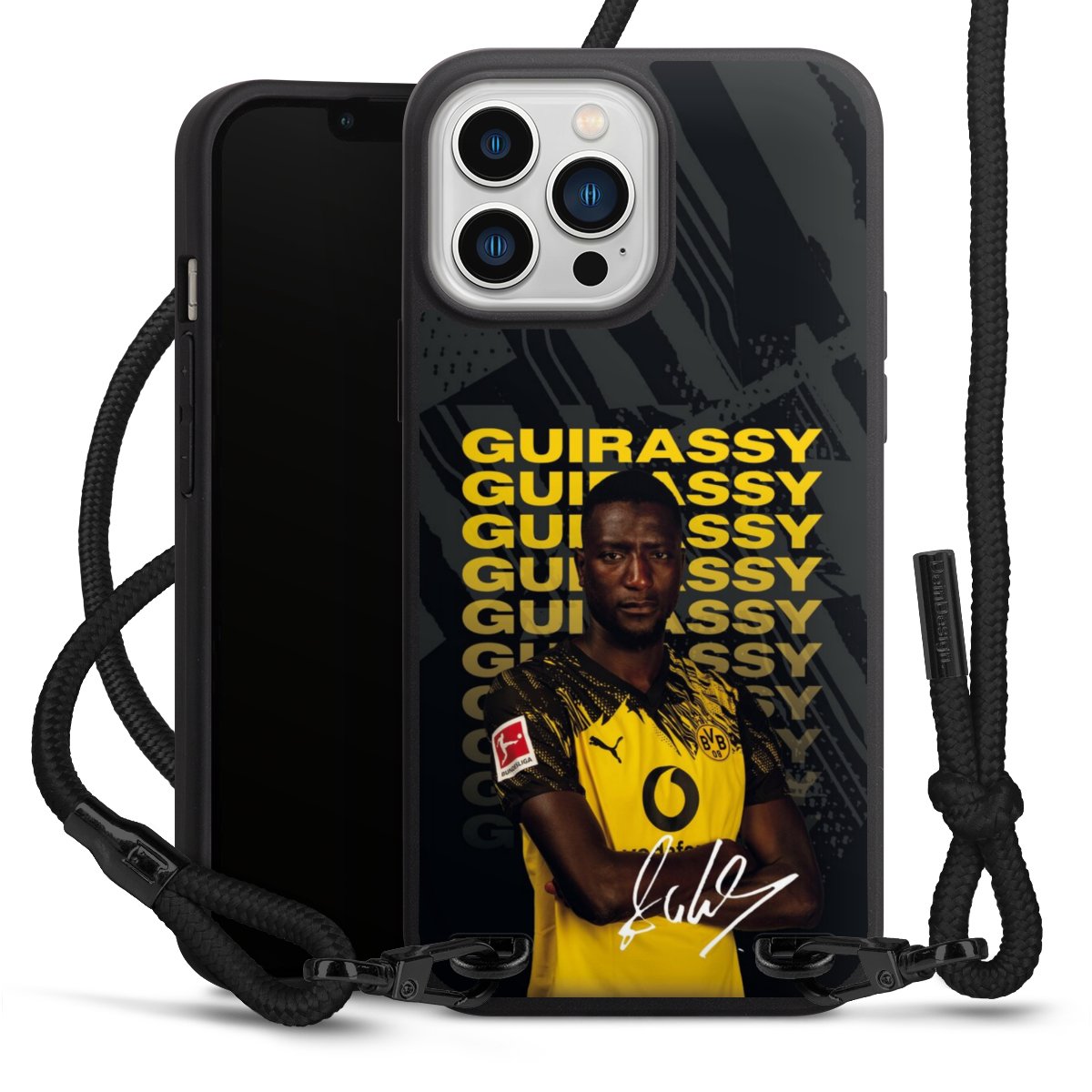The matt black silicone case is made of flexible TPU (thermoplastic polyurethane) and offers robust protection. The durable, unbreakable material makes the cover flexible and dimensionally stable at the same time. The matte surface makes your design stand out more and is less susceptible to fingerprints and dirt. The stylish trend accessory fits comfortably in the hand and is perfectly complemented by the fabric (polyester) mobile phone strap. The braided fabric strap is approx. 1.70 metres long with a diameter of approx. 0.5 cm. Due to the special knotting technique, the length of the strap can be adjusted by simply pulling it, so that you can adapt it individually to your wishes. The practical case to wear around your neck is available with the fabric strap in black. As a little icing on the cake, we have provided the strap with a chic metal fastener in matt black. The strap is securely fastened to the case with loops made of high-quality genuine leather and press studs. The ends of the fabric strap are covered with metallic end caps and thus protected from fraying.