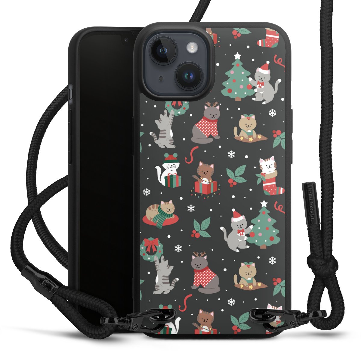 The matt black silicone case is made of flexible TPU (thermoplastic polyurethane) and offers robust protection. The durable, unbreakable material makes the cover flexible and dimensionally stable at the same time. The matte surface makes your design stand out more and is less susceptible to fingerprints and dirt. The stylish trend accessory fits comfortably in the hand and is perfectly complemented by the fabric (polyester) mobile phone strap. The braided fabric strap is approx. 1.70 metres long with a diameter of approx. 0.5 cm. Due to the special knotting technique, the length of the strap can be adjusted by simply pulling it, so that you can adapt it individually to your wishes. The practical case to wear around your neck is available with the fabric strap in black. As a little icing on the cake, we have provided the strap with a chic metal fastener in matt black. The strap is securely fastened to the case with loops made of high-quality genuine leather and press studs. The ends of the fabric strap are covered with metallic end caps and thus protected from fraying.