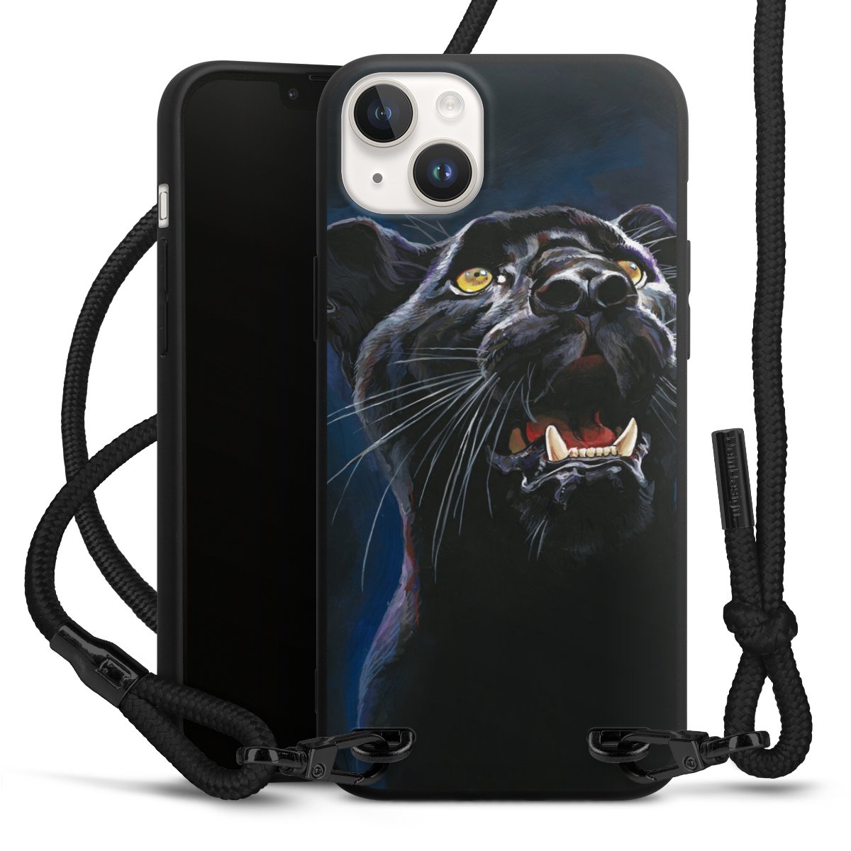 The matt black silicone case is made of flexible TPU (thermoplastic polyurethane) and offers robust protection. The durable, unbreakable material makes the cover flexible and dimensionally stable at the same time. The matte surface makes your design stand out more and is less susceptible to fingerprints and dirt. The stylish trend accessory fits comfortably in the hand and is perfectly complemented by the fabric (polyester) mobile phone strap. The braided fabric strap is approx. 1.70 metres long with a diameter of approx. 0.5 cm. Due to the special knotting technique, the length of the strap can be adjusted by simply pulling it, so that you can adapt it individually to your wishes. The practical case to wear around your neck is available with the fabric strap in black. As a little icing on the cake, we have provided the strap with a chic metal fastener in matt black. The strap is securely fastened to the case with loops made of high-quality genuine leather and press studs. The ends of the fabric strap are covered with metallic end caps and thus protected from fraying.