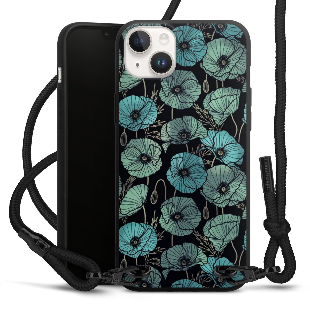 The matt black silicone case is made of flexible TPU (thermoplastic polyurethane) and offers robust protection. The durable, unbreakable material makes the cover flexible and dimensionally stable at the same time. The matte surface makes your design stand out more and is less susceptible to fingerprints and dirt. The stylish trend accessory fits comfortably in the hand and is perfectly complemented by the fabric (polyester) mobile phone strap. The braided fabric strap is approx. 1.70 metres long with a diameter of approx. 0.5 cm. Due to the special knotting technique, the length of the strap can be adjusted by simply pulling it, so that you can adapt it individually to your wishes. The practical case to wear around your neck is available with the fabric strap in black. As a little icing on the cake, we have provided the strap with a chic metal fastener in matt black. The strap is securely fastened to the case with loops made of high-quality genuine leather and press studs. The ends of the fabric strap are covered with metallic end caps and thus protected from fraying.