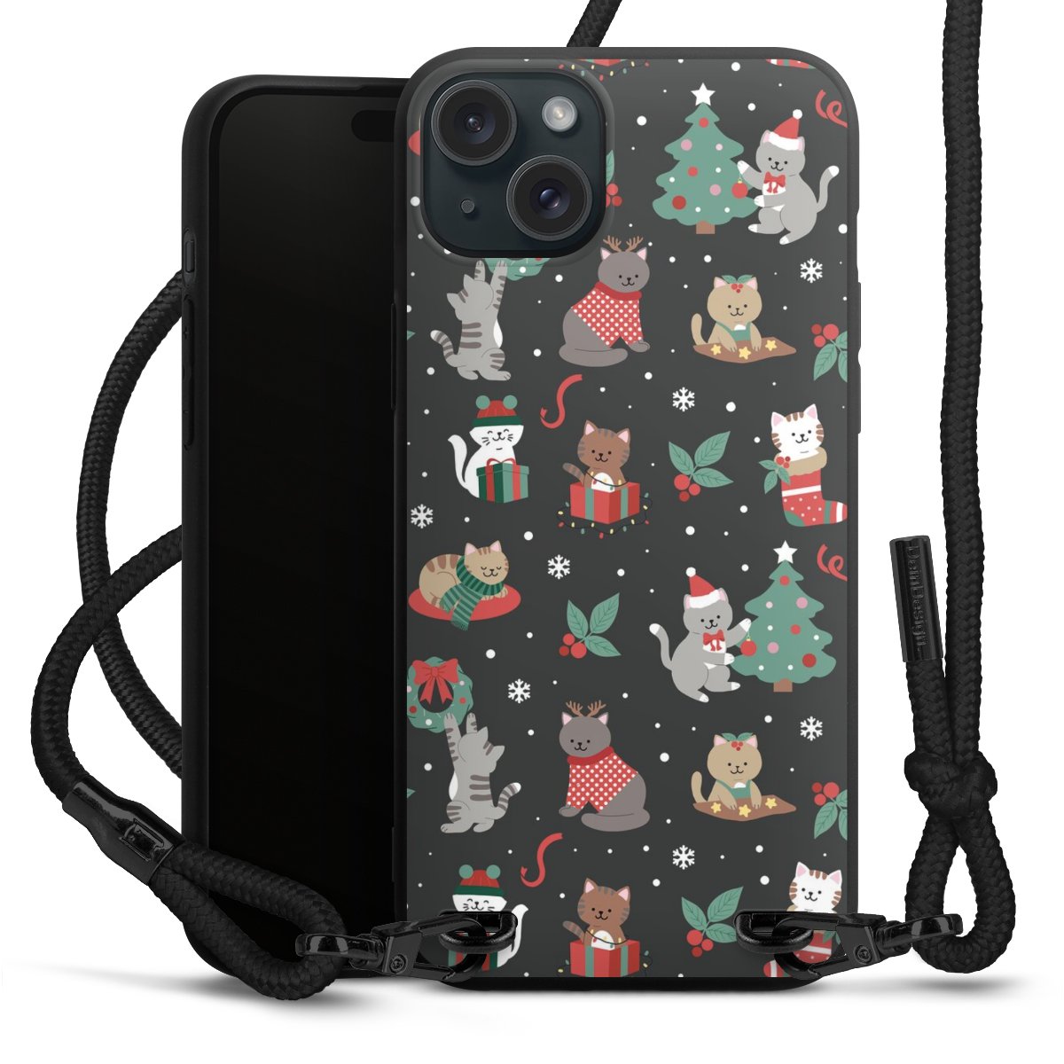 The matt black silicone case is made of flexible TPU (thermoplastic polyurethane) and offers robust protection. The durable, unbreakable material makes the cover flexible and dimensionally stable at the same time. The matte surface makes your design stand out more and is less susceptible to fingerprints and dirt. The stylish trend accessory fits comfortably in the hand and is perfectly complemented by the fabric (polyester) mobile phone strap. The braided fabric strap is approx. 1.70 metres long with a diameter of approx. 0.5 cm. Due to the special knotting technique, the length of the strap can be adjusted by simply pulling it, so that you can adapt it individually to your wishes. The practical case to wear around your neck is available with the fabric strap in black. As a little icing on the cake, we have provided the strap with a chic metal fastener in matt black. The strap is securely fastened to the case with loops made of high-quality genuine leather and press studs. The ends of the fabric strap are covered with metallic end caps and thus protected from fraying.