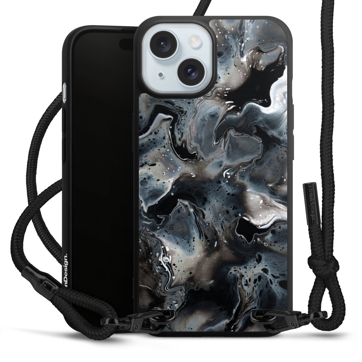 Pure Black: Phone case, fabric strap and metal details in stylish matt black.