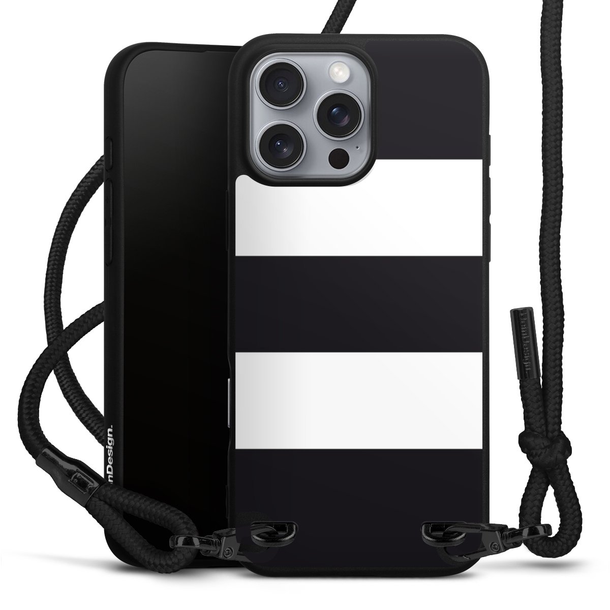 Pure Black: Phone case, fabric strap and metal details in stylish matt black.