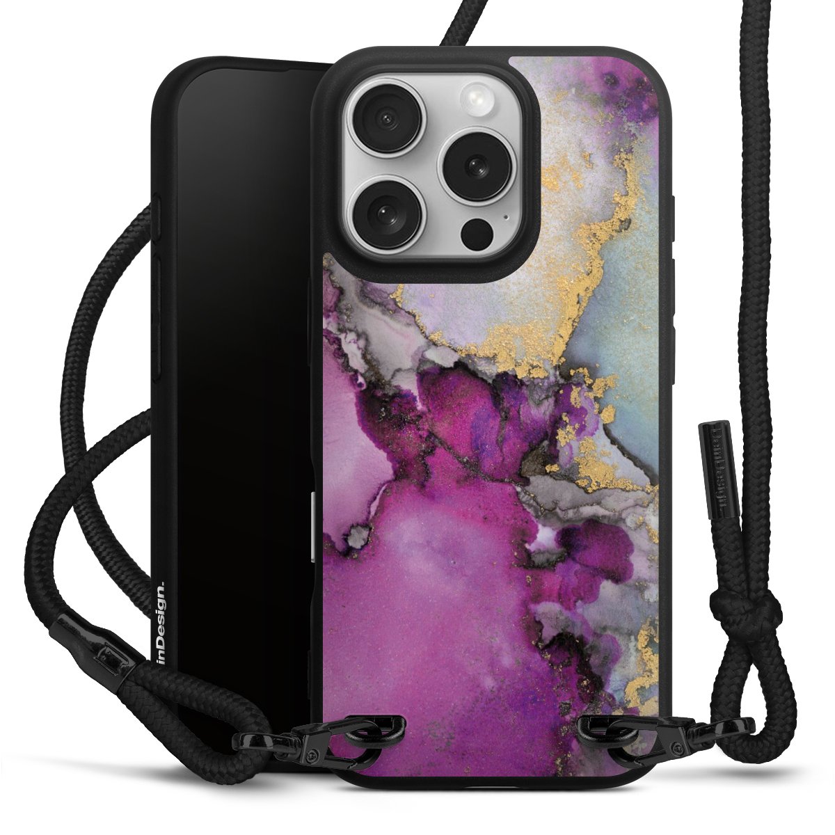 Pure Black: Phone case, fabric strap and metal details in stylish matt black.