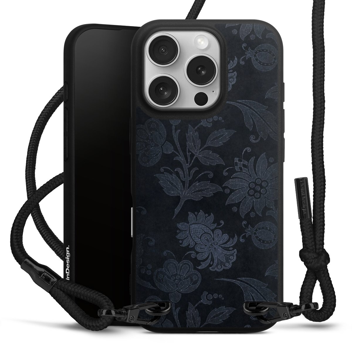 Pure Black: Phone case, fabric strap and metal details in stylish matt black.