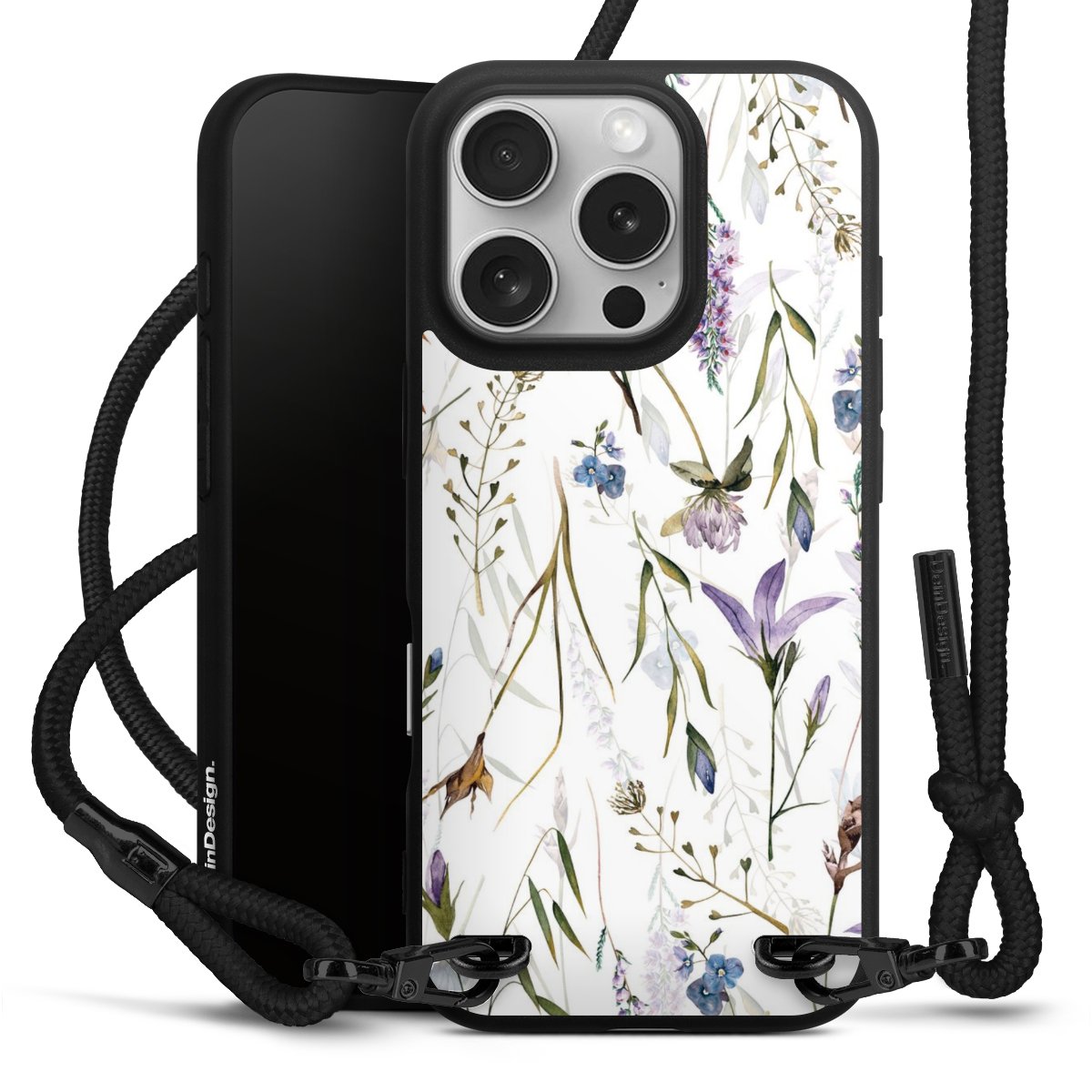 Pure Black: Phone case, fabric strap and metal details in stylish matt black.