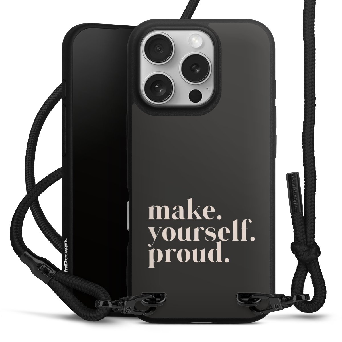 Pure Black: Phone case, fabric strap and metal details in stylish matt black.