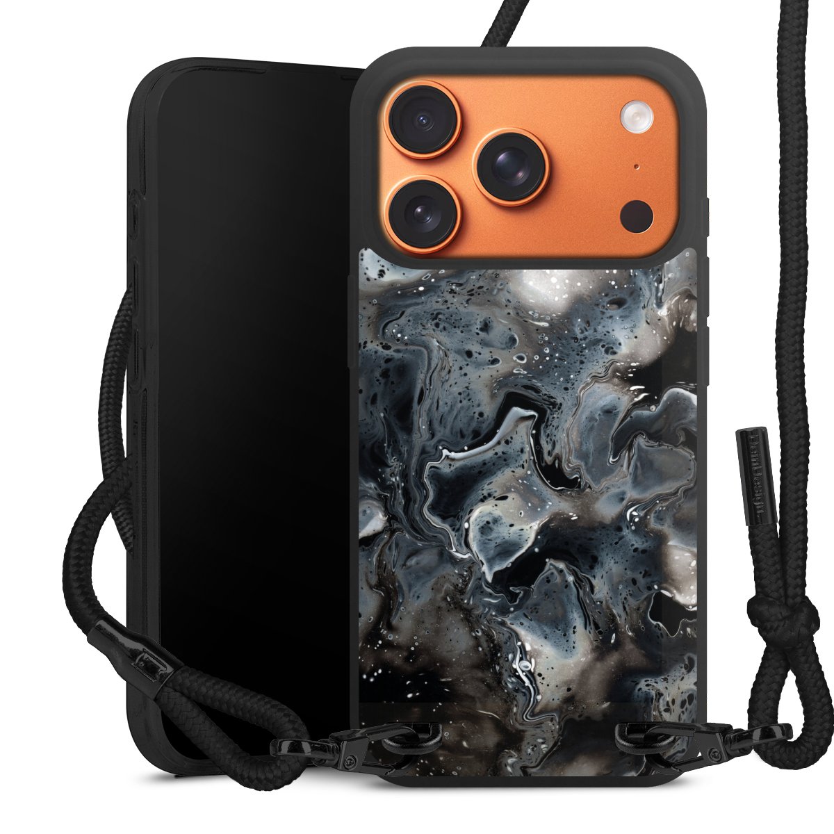 Pure Black: Phone case, fabric strap and metal details in stylish matt black.