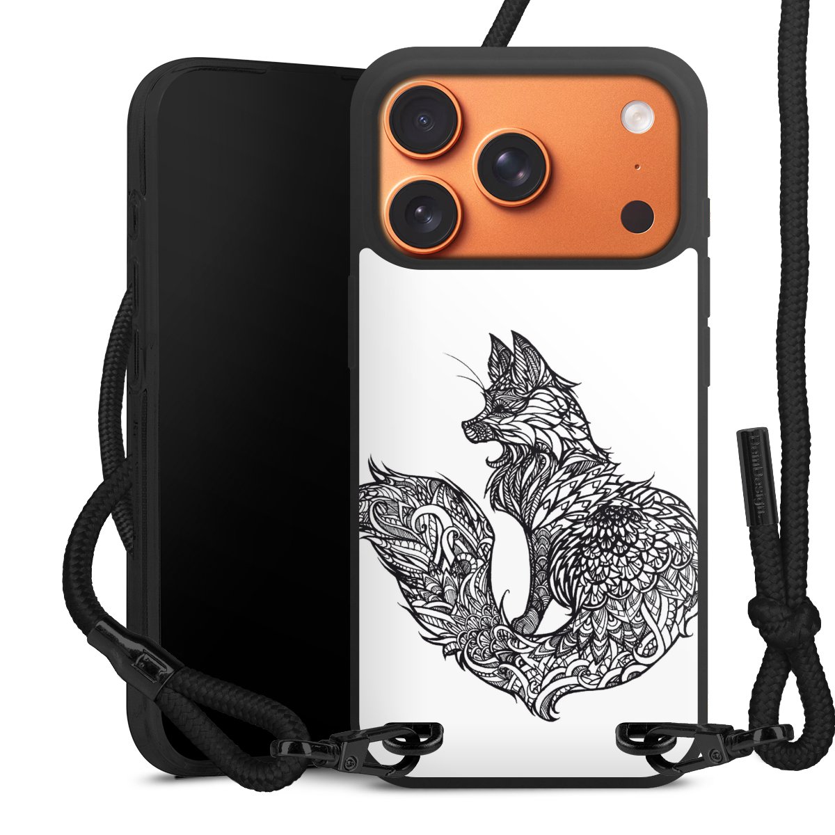 The matt black silicone case is made of flexible TPU (thermoplastic polyurethane) and offers robust protection. The durable, unbreakable material makes the cover flexible and dimensionally stable at the same time. The matte surface makes your design stand out more and is less susceptible to fingerprints and dirt. The stylish trend accessory fits comfortably in the hand and is perfectly complemented by the fabric (polyester) mobile phone strap. The braided fabric strap is approx. 1.70 metres long with a diameter of approx. 0.5 cm. Due to the special knotting technique, the length of the strap can be adjusted by simply pulling it, so that you can adapt it individually to your wishes. The practical case to wear around your neck is available with the fabric strap in black. As a little icing on the cake, we have provided the strap with a chic metal fastener in matt black. The strap is securely fastened to the case with loops made of high-quality genuine leather and press studs. The ends of the fabric strap are covered with metallic end caps and thus protected from fraying.