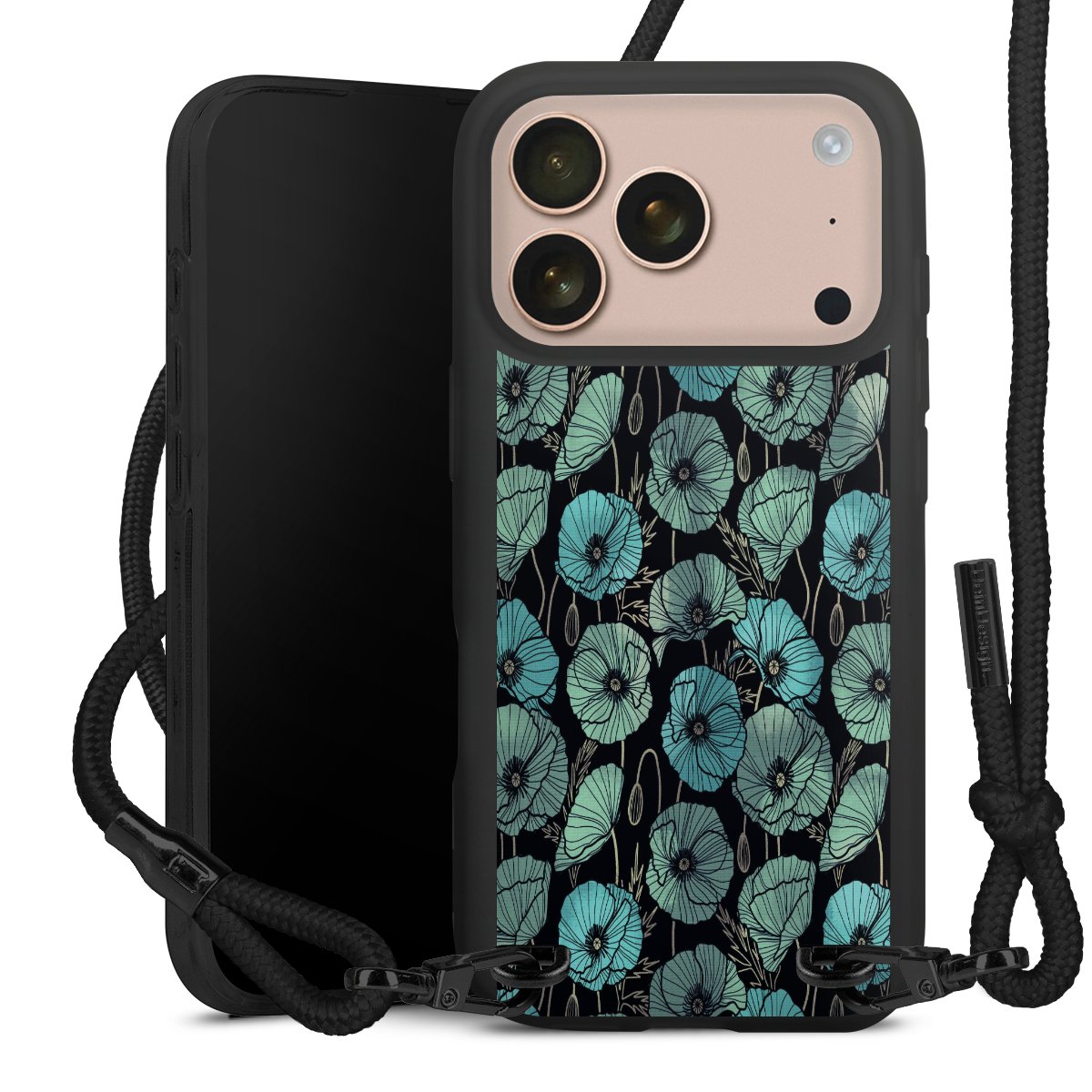 The matt black silicone case is made of flexible TPU (thermoplastic polyurethane) and offers robust protection. The durable, unbreakable material makes the cover flexible and dimensionally stable at the same time. The matte surface makes your design stand out more and is less susceptible to fingerprints and dirt. The stylish trend accessory fits comfortably in the hand and is perfectly complemented by the fabric (polyester) mobile phone strap. The braided fabric strap is approx. 1.70 metres long with a diameter of approx. 0.5 cm. Due to the special knotting technique, the length of the strap can be adjusted by simply pulling it, so that you can adapt it individually to your wishes. The practical case to wear around your neck is available with the fabric strap in black. As a little icing on the cake, we have provided the strap with a chic metal fastener in matt black. The strap is securely fastened to the case with loops made of high-quality genuine leather and press studs. The ends of the fabric strap are covered with metallic end caps and thus protected from fraying.