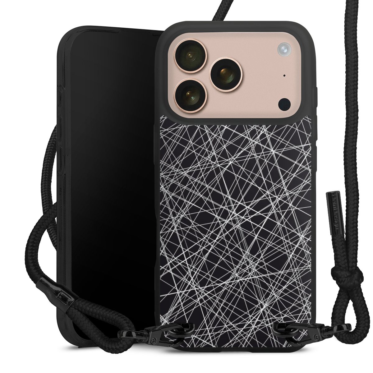 Pure Black: Phone case, fabric strap and metal details in stylish matt black.