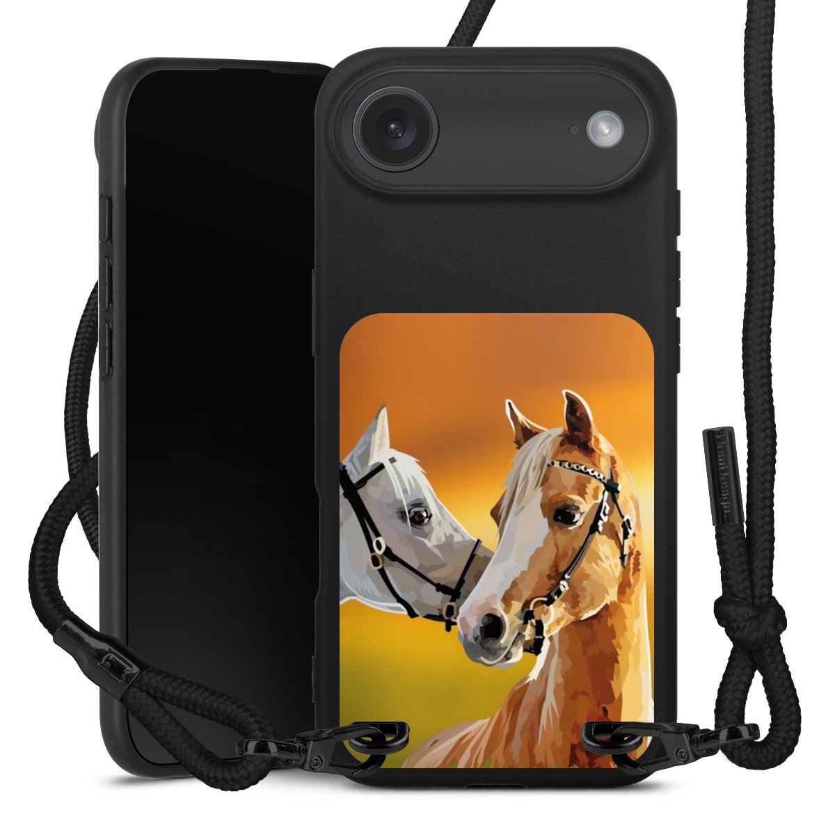 The matt black silicone case is made of flexible TPU (thermoplastic polyurethane) and offers robust protection. The durable, unbreakable material makes the cover flexible and dimensionally stable at the same time. The matte surface makes your design stand out more and is less susceptible to fingerprints and dirt. The stylish trend accessory fits comfortably in the hand and is perfectly complemented by the fabric (polyester) mobile phone strap. The braided fabric strap is approx. 1.70 metres long with a diameter of approx. 0.5 cm. Due to the special knotting technique, the length of the strap can be adjusted by simply pulling it, so that you can adapt it individually to your wishes. The practical case to wear around your neck is available with the fabric strap in black. As a little icing on the cake, we have provided the strap with a chic metal fastener in matt black. The strap is securely fastened to the case with loops made of high-quality genuine leather and press studs. The ends of the fabric strap are covered with metallic end caps and thus protected from fraying.