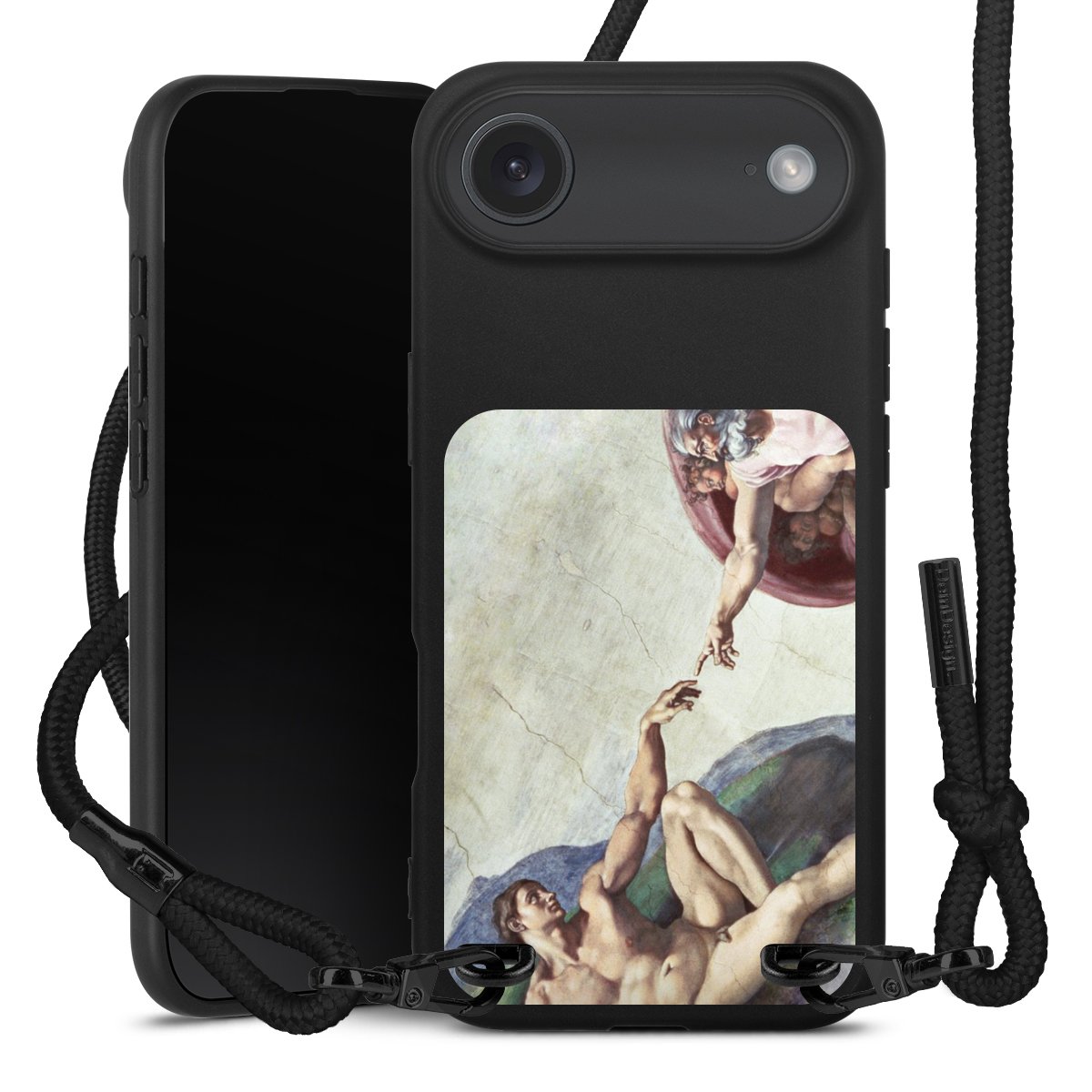 The matt black silicone case is made of flexible TPU (thermoplastic polyurethane) and offers robust protection. The durable, unbreakable material makes the cover flexible and dimensionally stable at the same time. The matte surface makes your design stand out more and is less susceptible to fingerprints and dirt. The stylish trend accessory fits comfortably in the hand and is perfectly complemented by the fabric (polyester) mobile phone strap. The braided fabric strap is approx. 1.70 metres long with a diameter of approx. 0.5 cm. Due to the special knotting technique, the length of the strap can be adjusted by simply pulling it, so that you can adapt it individually to your wishes. The practical case to wear around your neck is available with the fabric strap in black. As a little icing on the cake, we have provided the strap with a chic metal fastener in matt black. The strap is securely fastened to the case with loops made of high-quality genuine leather and press studs. The ends of the fabric strap are covered with metallic end caps and thus protected from fraying.