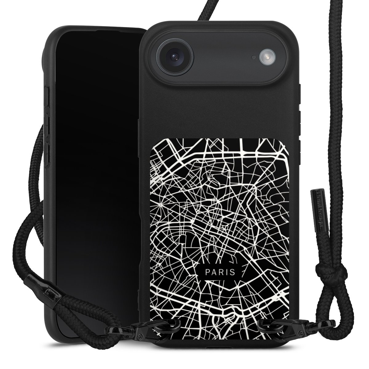 The matt black silicone case is made of flexible TPU (thermoplastic polyurethane) and offers robust protection. The durable, unbreakable material makes the cover flexible and dimensionally stable at the same time. The matte surface makes your design stand out more and is less susceptible to fingerprints and dirt. The stylish trend accessory fits comfortably in the hand and is perfectly complemented by the fabric (polyester) mobile phone strap. The braided fabric strap is approx. 1.70 metres long with a diameter of approx. 0.5 cm. Due to the special knotting technique, the length of the strap can be adjusted by simply pulling it, so that you can adapt it individually to your wishes. The practical case to wear around your neck is available with the fabric strap in black. As a little icing on the cake, we have provided the strap with a chic metal fastener in matt black. The strap is securely fastened to the case with loops made of high-quality genuine leather and press studs. The ends of the fabric strap are covered with metallic end caps and thus protected from fraying.