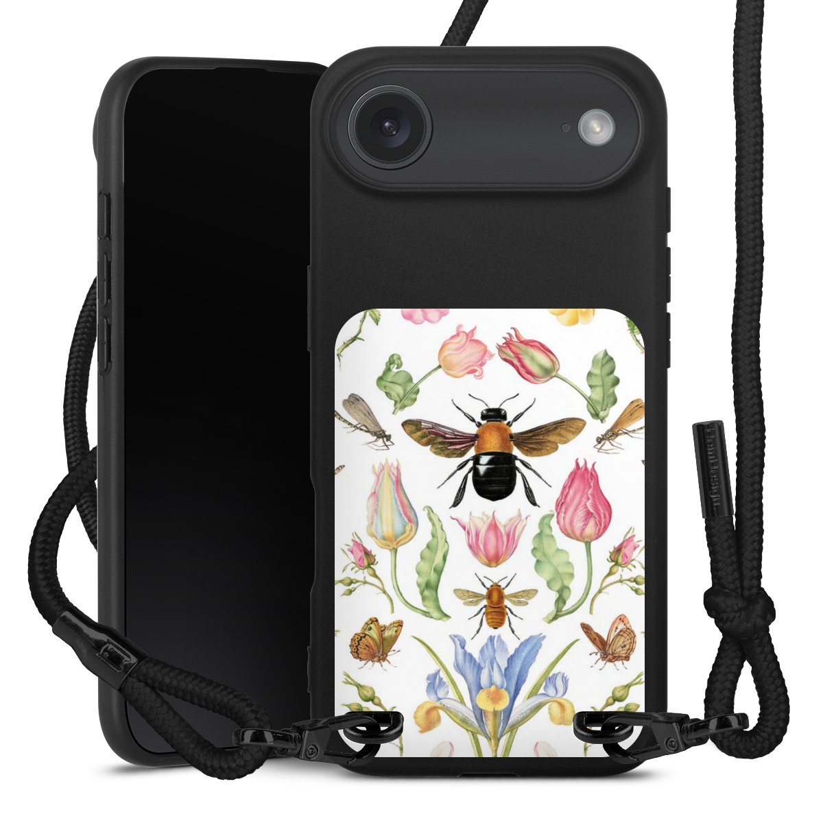 Pure Black: Phone case, fabric strap and metal details in stylish matt black.