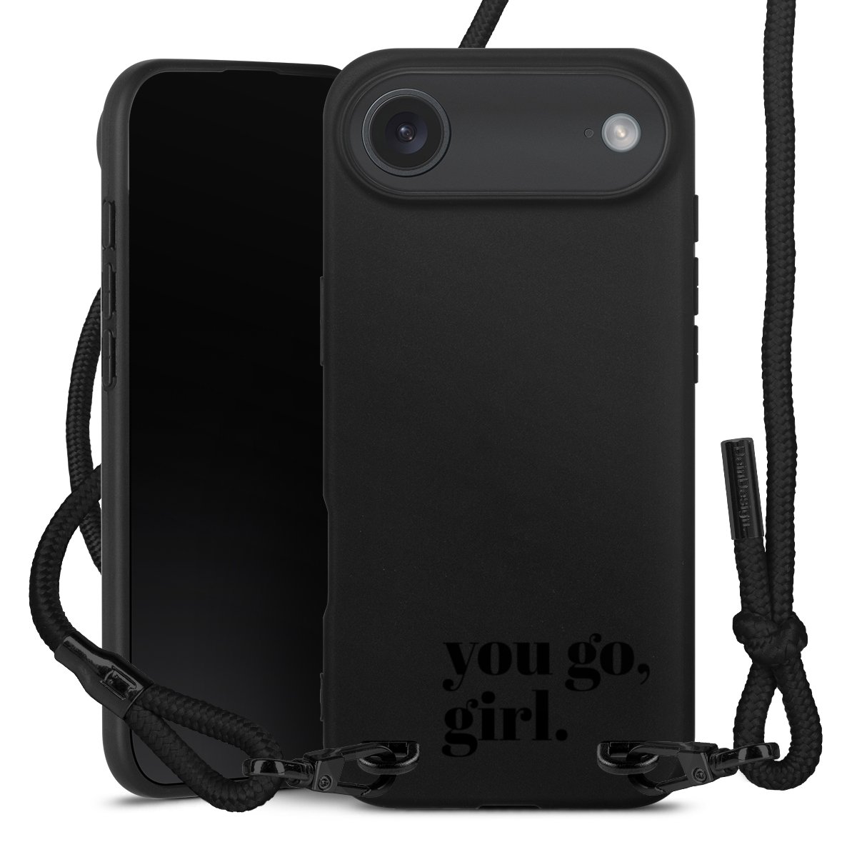 Pure Black: Phone case, fabric strap and metal details in stylish matt black.