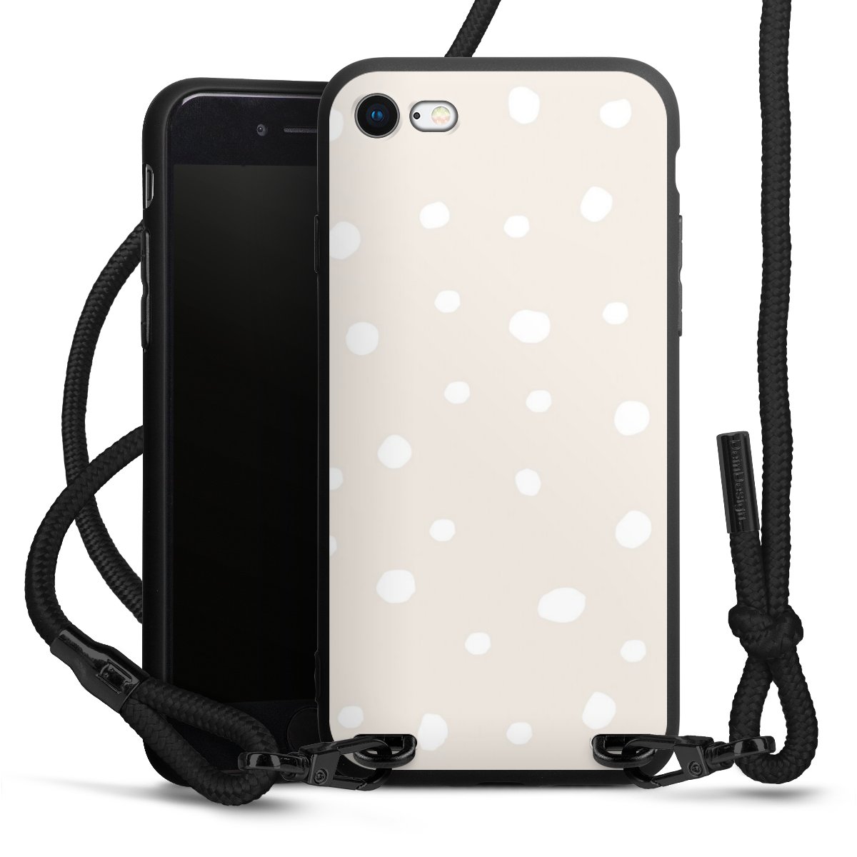 The matt black silicone case is made of flexible TPU (thermoplastic polyurethane) and offers robust protection. The durable, unbreakable material makes the cover flexible and dimensionally stable at the same time. The matte surface makes your design stand out more and is less susceptible to fingerprints and dirt. The stylish trend accessory fits comfortably in the hand and is perfectly complemented by the fabric (polyester) mobile phone strap. The braided fabric strap is approx. 1.70 metres long with a diameter of approx. 0.5 cm. Due to the special knotting technique, the length of the strap can be adjusted by simply pulling it, so that you can adapt it individually to your wishes. The practical case to wear around your neck is available with the fabric strap in black. As a little icing on the cake, we have provided the strap with a chic metal fastener in matt black. The strap is securely fastened to the case with loops made of high-quality genuine leather and press studs. The ends of the fabric strap are covered with metallic end caps and thus protected from fraying.