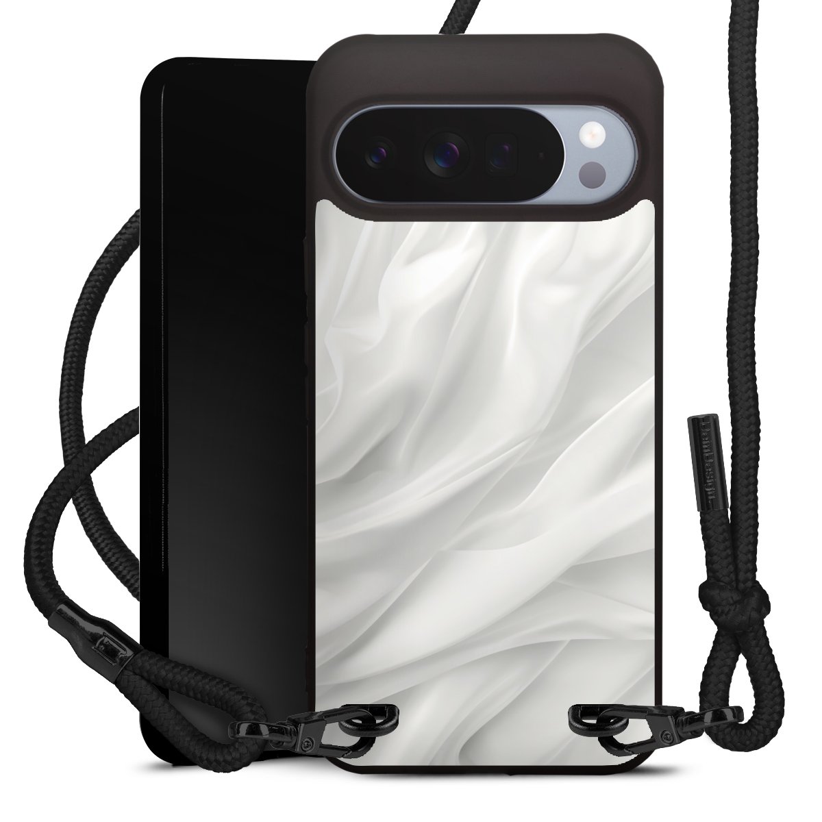 The matt black silicone case is made of flexible TPU (thermoplastic polyurethane) and offers robust protection. The durable, unbreakable material makes the cover flexible and dimensionally stable at the same time. The matte surface makes your design stand out more and is less susceptible to fingerprints and dirt. The stylish trend accessory fits comfortably in the hand and is perfectly complemented by the fabric (polyester) mobile phone strap. The braided fabric strap is approx. 1.70 metres long with a diameter of approx. 0.5 cm. Due to the special knotting technique, the length of the strap can be adjusted by simply pulling it, so that you can adapt it individually to your wishes. The practical case to wear around your neck is available with the fabric strap in black. As a little icing on the cake, we have provided the strap with a chic metal fastener in matt black. The strap is securely fastened to the case with loops made of high-quality genuine leather and press studs. The ends of the fabric strap are covered with metallic end caps and thus protected from fraying.