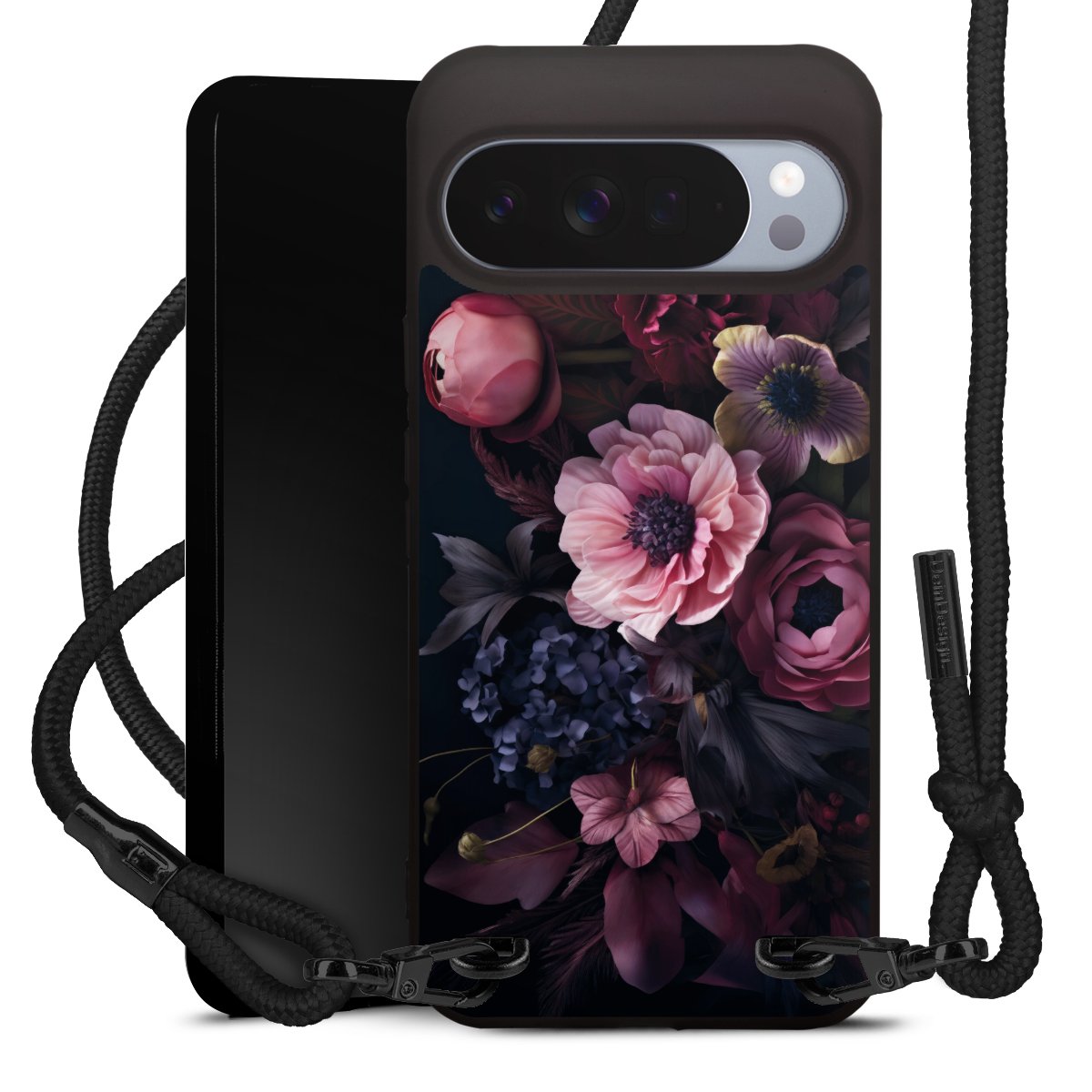 Pure Black: Phone case, fabric strap and metal details in stylish matt black.