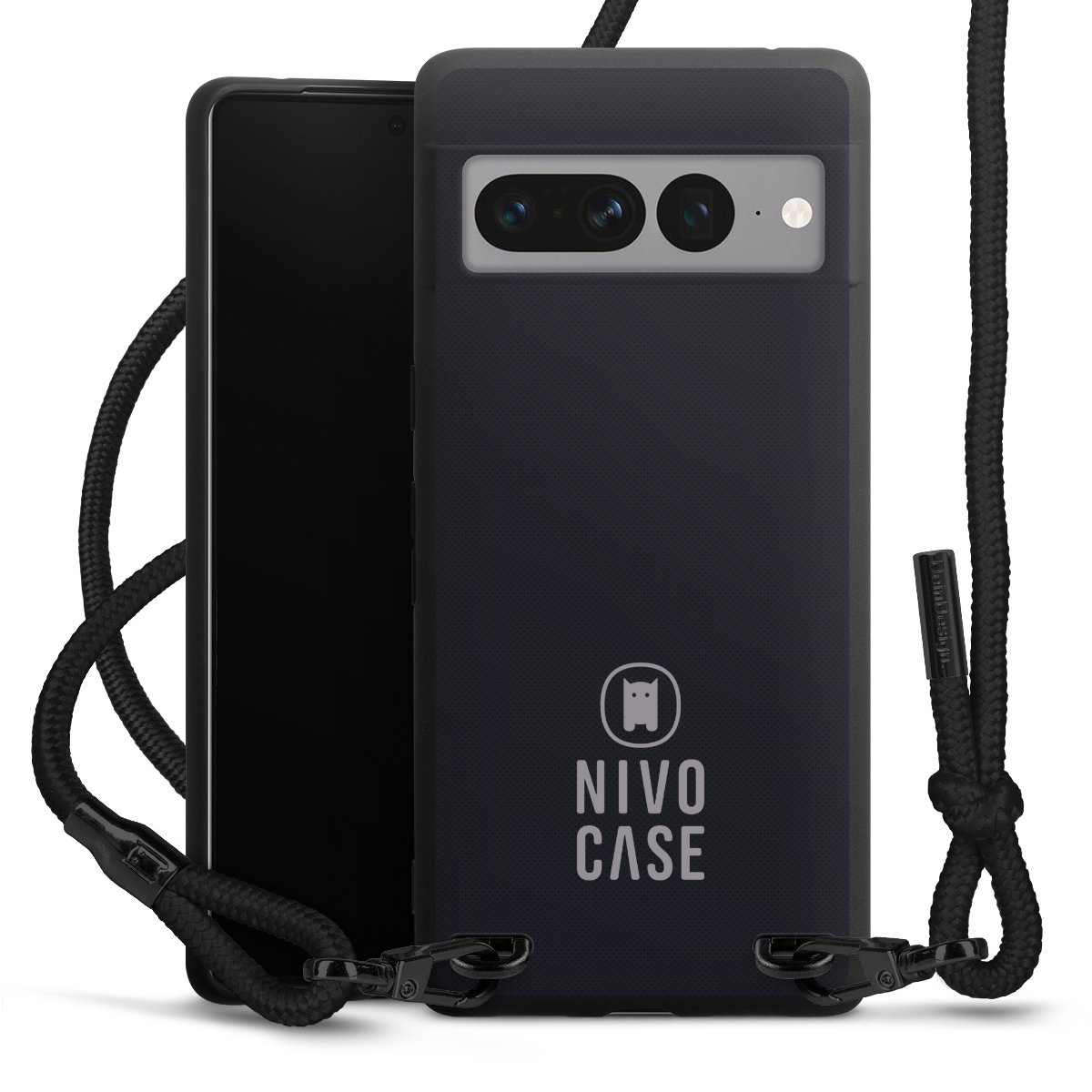 The matt black silicone case is made of flexible TPU (thermoplastic polyurethane) and offers robust protection. The durable, unbreakable material makes the cover flexible and dimensionally stable at the same time. The matte surface makes your design stand out more and is less susceptible to fingerprints and dirt. The stylish trend accessory fits comfortably in the hand and is perfectly complemented by the fabric (polyester) mobile phone strap. The braided fabric strap is approx. 1.70 metres long with a diameter of approx. 0.5 cm. Due to the special knotting technique, the length of the strap can be adjusted by simply pulling it, so that you can adapt it individually to your wishes. The practical case to wear around your neck is available with the fabric strap in black. As a little icing on the cake, we have provided the strap with a chic metal fastener in matt black. The strap is securely fastened to the case with loops made of high-quality genuine leather and press studs. The ends of the fabric strap are covered with metallic end caps and thus protected from fraying.