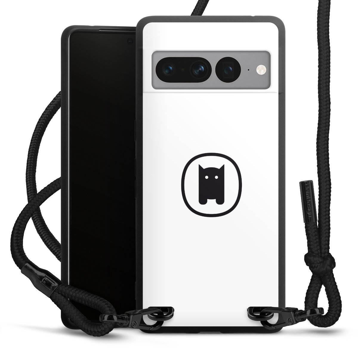 The matt black silicone case is made of flexible TPU (thermoplastic polyurethane) and offers robust protection. The durable, unbreakable material makes the cover flexible and dimensionally stable at the same time. The matte surface makes your design stand out more and is less susceptible to fingerprints and dirt. The stylish trend accessory fits comfortably in the hand and is perfectly complemented by the fabric (polyester) mobile phone strap. The braided fabric strap is approx. 1.70 metres long with a diameter of approx. 0.5 cm. Due to the special knotting technique, the length of the strap can be adjusted by simply pulling it, so that you can adapt it individually to your wishes. The practical case to wear around your neck is available with the fabric strap in black. As a little icing on the cake, we have provided the strap with a chic metal fastener in matt black. The strap is securely fastened to the case with loops made of high-quality genuine leather and press studs. The ends of the fabric strap are covered with metallic end caps and thus protected from fraying.