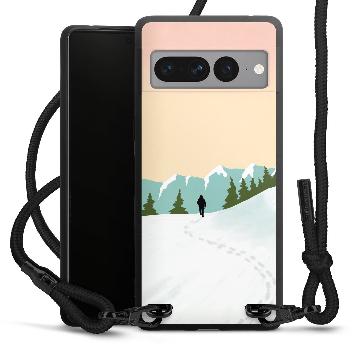We use the solid direct print process for this phone case, which is why the print area only covers the back and the edge remains unprinted. The case to wear around your neck can be ordered unprinted, fully printed, or partially printed. For your design, either choose one of our exclusive shop motifs or get creative and create your own design, for example with photos and overlays. Design your own personal trend accessory and make an individual statement on the streets!