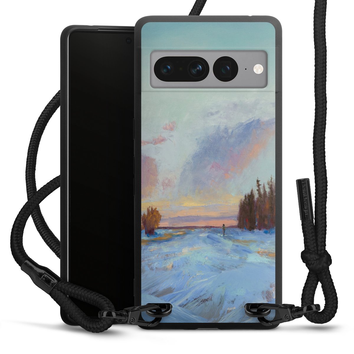 We use the solid direct print process for this phone case, which is why the print area only covers the back and the edge remains unprinted. The case to wear around your neck can be ordered unprinted, fully printed, or partially printed. For your design, either choose one of our exclusive shop motifs or get creative and create your own design, for example with photos and overlays. Design your own personal trend accessory and make an individual statement on the streets!