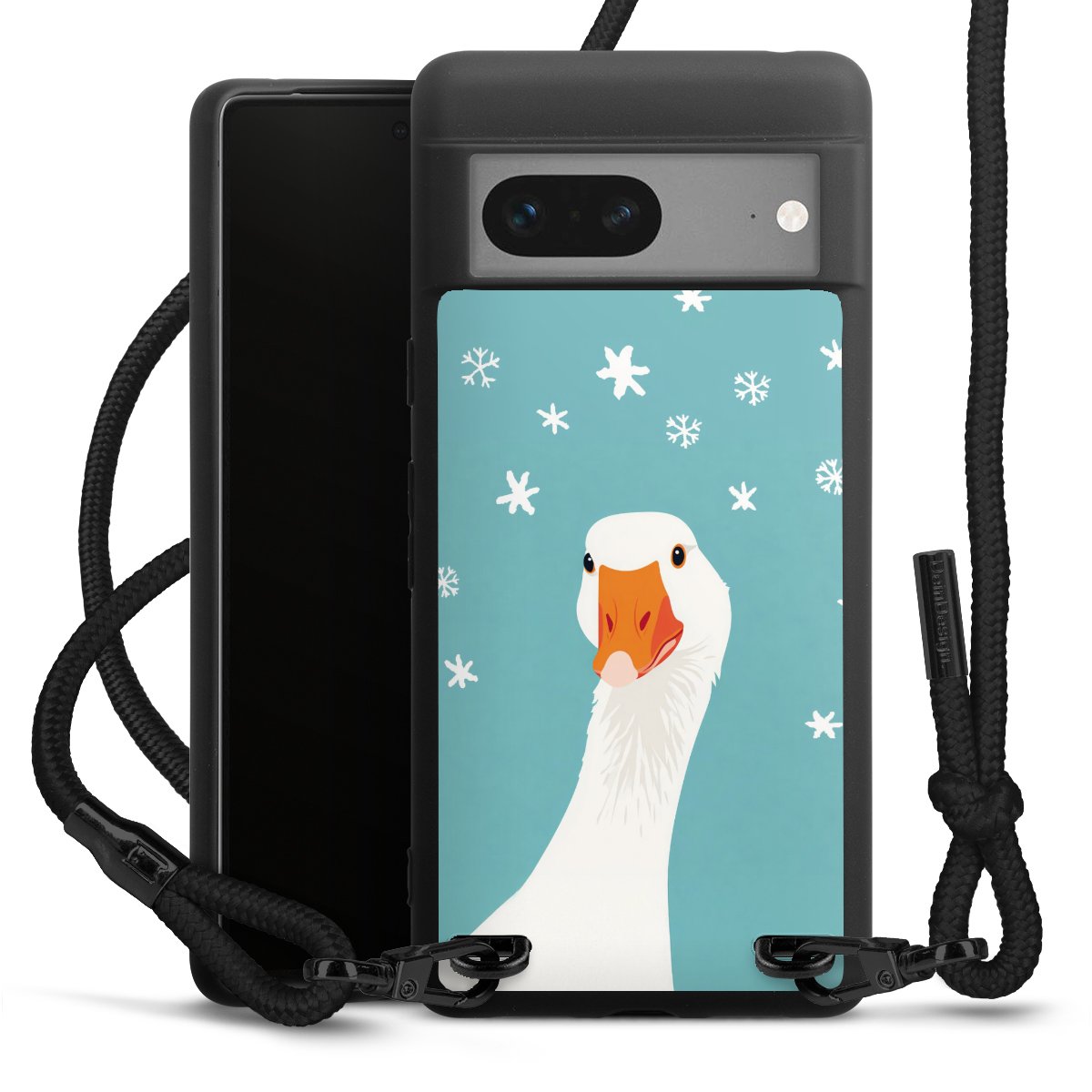 The matt black silicone case is made of flexible TPU (thermoplastic polyurethane) and offers robust protection. The durable, unbreakable material makes the cover flexible and dimensionally stable at the same time. The matte surface makes your design stand out more and is less susceptible to fingerprints and dirt. The stylish trend accessory fits comfortably in the hand and is perfectly complemented by the fabric (polyester) mobile phone strap. The braided fabric strap is approx. 1.70 metres long with a diameter of approx. 0.5 cm. Due to the special knotting technique, the length of the strap can be adjusted by simply pulling it, so that you can adapt it individually to your wishes. The practical case to wear around your neck is available with the fabric strap in black. As a little icing on the cake, we have provided the strap with a chic metal fastener in matt black. The strap is securely fastened to the case with loops made of high-quality genuine leather and press studs. The ends of the fabric strap are covered with metallic end caps and thus protected from fraying.
