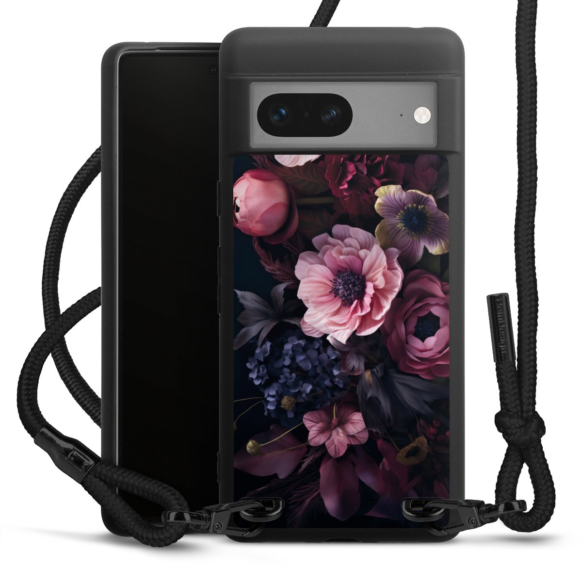 The matt black silicone case is made of flexible TPU (thermoplastic polyurethane) and offers robust protection. The durable, unbreakable material makes the cover flexible and dimensionally stable at the same time. The matte surface makes your design stand out more and is less susceptible to fingerprints and dirt. The stylish trend accessory fits comfortably in the hand and is perfectly complemented by the fabric (polyester) mobile phone strap. The braided fabric strap is approx. 1.70 metres long with a diameter of approx. 0.5 cm. Due to the special knotting technique, the length of the strap can be adjusted by simply pulling it, so that you can adapt it individually to your wishes. The practical case to wear around your neck is available with the fabric strap in black. As a little icing on the cake, we have provided the strap with a chic metal fastener in matt black. The strap is securely fastened to the case with loops made of high-quality genuine leather and press studs. The ends of the fabric strap are covered with metallic end caps and thus protected from fraying.