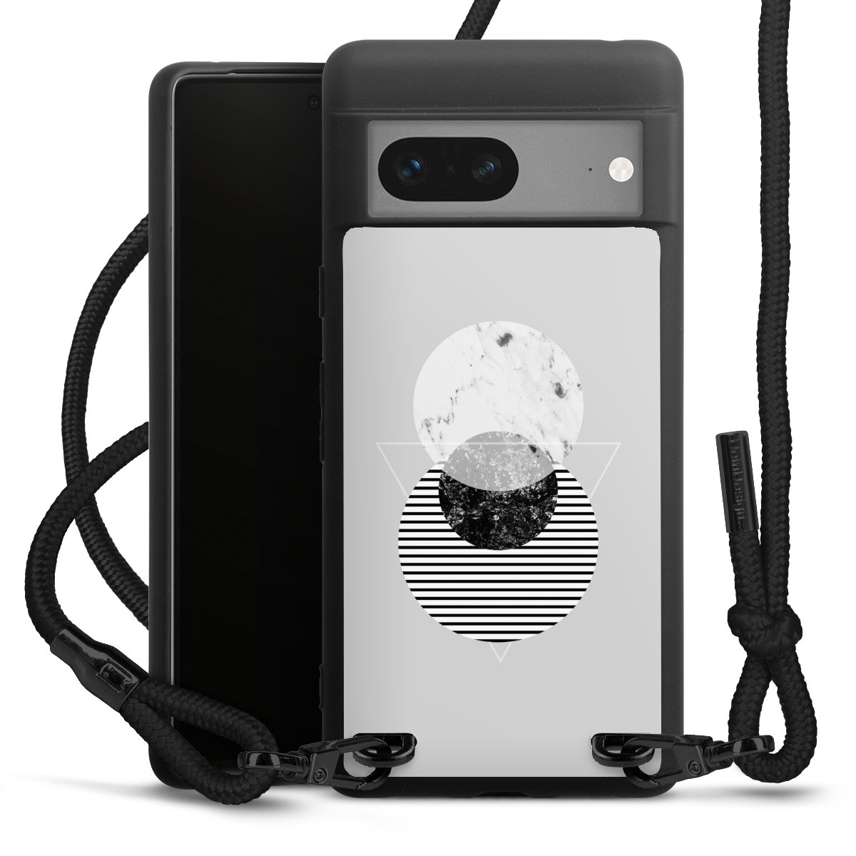 The matt black silicone case is made of flexible TPU (thermoplastic polyurethane) and offers robust protection. The durable, unbreakable material makes the cover flexible and dimensionally stable at the same time. The matte surface makes your design stand out more and is less susceptible to fingerprints and dirt. The stylish trend accessory fits comfortably in the hand and is perfectly complemented by the fabric (polyester) mobile phone strap. The braided fabric strap is approx. 1.70 metres long with a diameter of approx. 0.5 cm. Due to the special knotting technique, the length of the strap can be adjusted by simply pulling it, so that you can adapt it individually to your wishes. The practical case to wear around your neck is available with the fabric strap in black. As a little icing on the cake, we have provided the strap with a chic metal fastener in matt black. The strap is securely fastened to the case with loops made of high-quality genuine leather and press studs. The ends of the fabric strap are covered with metallic end caps and thus protected from fraying.