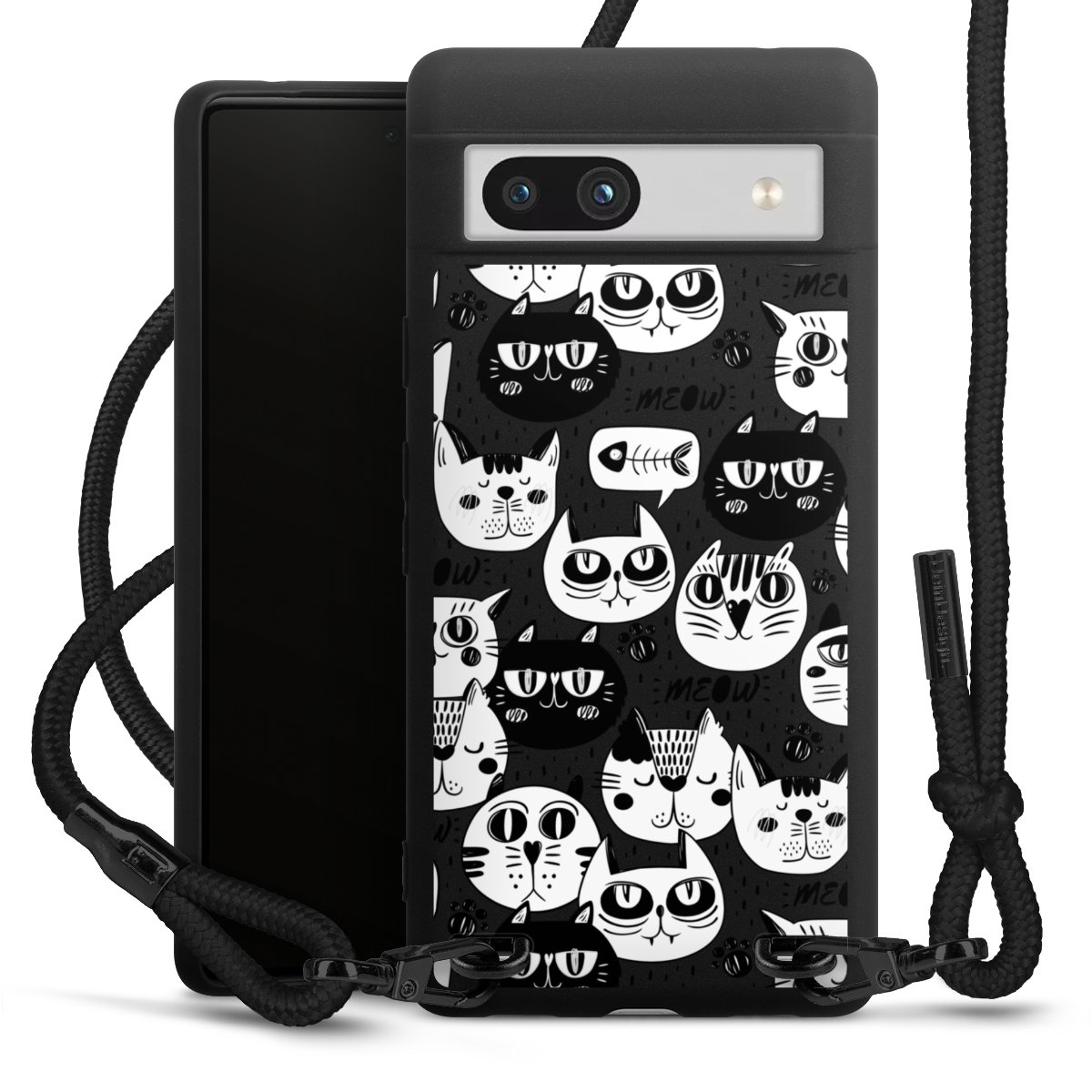 The matt black silicone case is made of flexible TPU (thermoplastic polyurethane) and offers robust protection. The durable, unbreakable material makes the cover flexible and dimensionally stable at the same time. The matte surface makes your design stand out more and is less susceptible to fingerprints and dirt. The stylish trend accessory fits comfortably in the hand and is perfectly complemented by the fabric (polyester) mobile phone strap. The braided fabric strap is approx. 1.70 metres long with a diameter of approx. 0.5 cm. Due to the special knotting technique, the length of the strap can be adjusted by simply pulling it, so that you can adapt it individually to your wishes. The practical case to wear around your neck is available with the fabric strap in black. As a little icing on the cake, we have provided the strap with a chic metal fastener in matt black. The strap is securely fastened to the case with loops made of high-quality genuine leather and press studs. The ends of the fabric strap are covered with metallic end caps and thus protected from fraying.