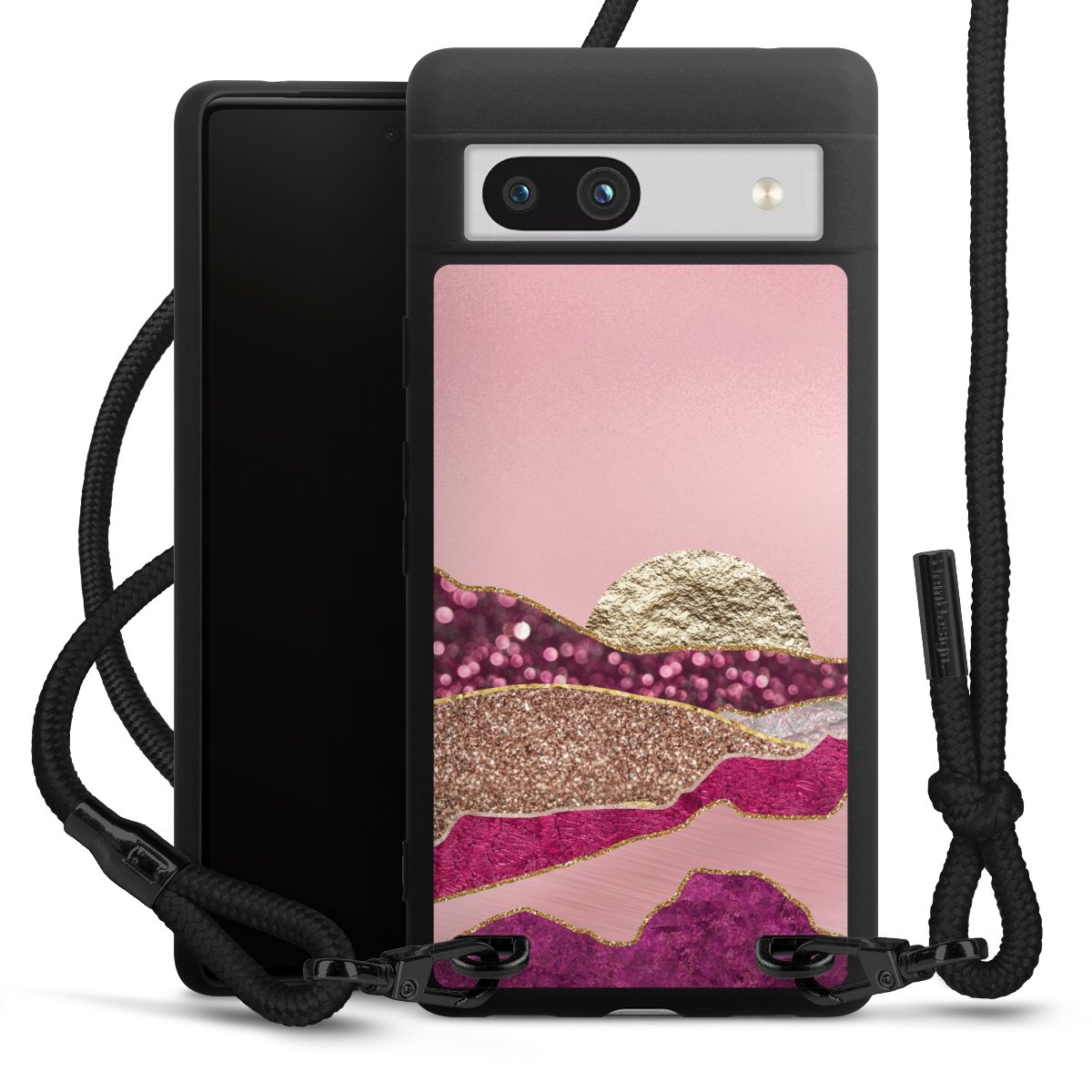 We use the solid direct print process for this phone case, which is why the print area only covers the back and the edge remains unprinted. The case to wear around your neck can be ordered unprinted, fully printed, or partially printed. For your design, either choose one of our exclusive shop motifs or get creative and create your own design, for example with photos and overlays. Design your own personal trend accessory and make an individual statement on the streets!