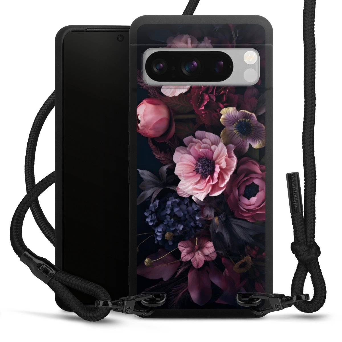 Pure Black: Phone case, fabric strap and metal details in stylish matt black.