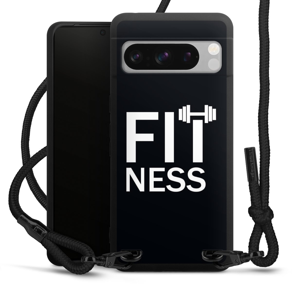 The matt black silicone case is made of flexible TPU (thermoplastic polyurethane) and offers robust protection. The durable, unbreakable material makes the cover flexible and dimensionally stable at the same time. The matte surface makes your design stand out more and is less susceptible to fingerprints and dirt. The stylish trend accessory fits comfortably in the hand and is perfectly complemented by the fabric (polyester) mobile phone strap. The braided fabric strap is approx. 1.70 metres long with a diameter of approx. 0.5 cm. Due to the special knotting technique, the length of the strap can be adjusted by simply pulling it, so that you can adapt it individually to your wishes. The practical case to wear around your neck is available with the fabric strap in black. As a little icing on the cake, we have provided the strap with a chic metal fastener in matt black. The strap is securely fastened to the case with loops made of high-quality genuine leather and press studs. The ends of the fabric strap are covered with metallic end caps and thus protected from fraying.