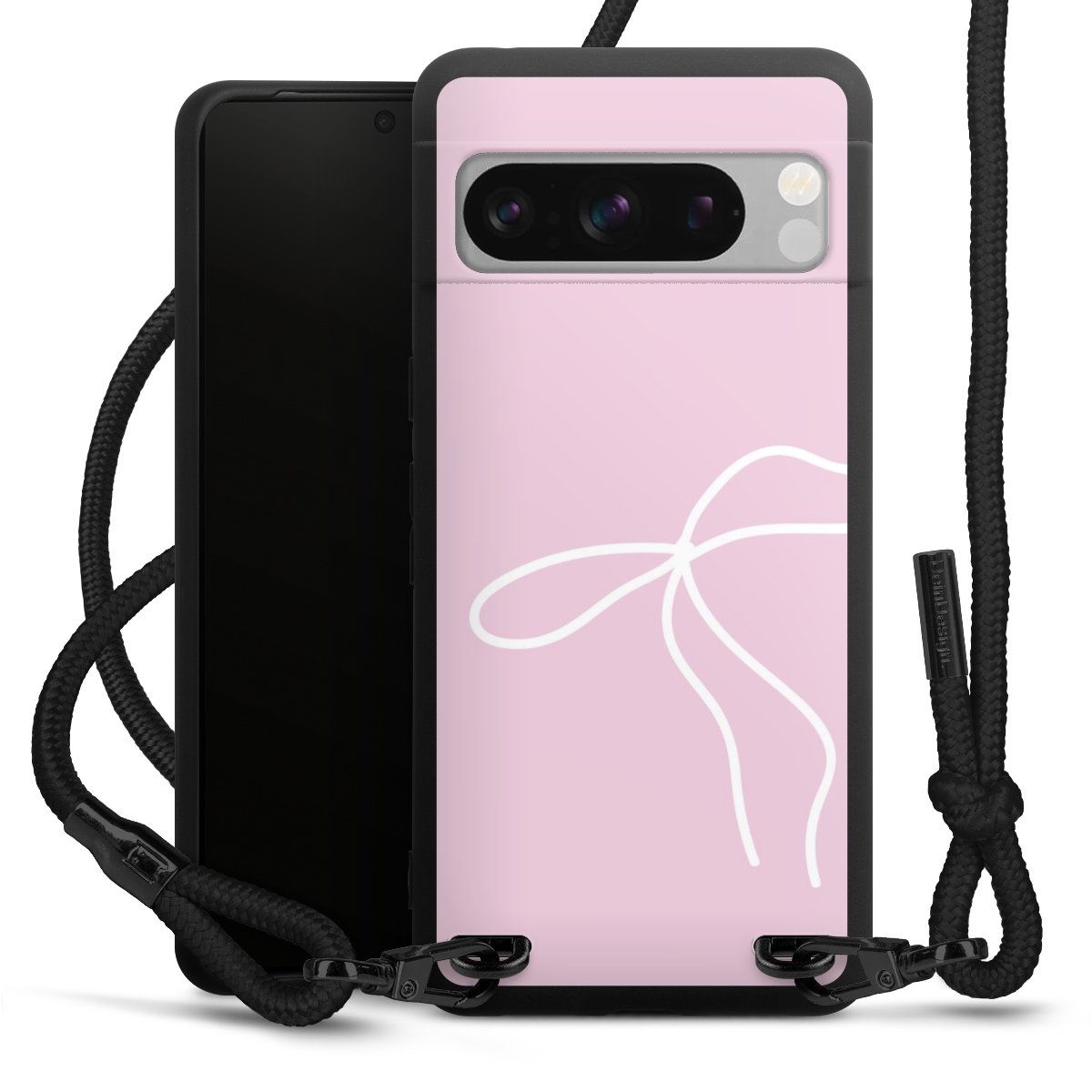 The matt black silicone case is made of flexible TPU (thermoplastic polyurethane) and offers robust protection. The durable, unbreakable material makes the cover flexible and dimensionally stable at the same time. The matte surface makes your design stand out more and is less susceptible to fingerprints and dirt. The stylish trend accessory fits comfortably in the hand and is perfectly complemented by the fabric (polyester) mobile phone strap. The braided fabric strap is approx. 1.70 metres long with a diameter of approx. 0.5 cm. Due to the special knotting technique, the length of the strap can be adjusted by simply pulling it, so that you can adapt it individually to your wishes. The practical case to wear around your neck is available with the fabric strap in black. As a little icing on the cake, we have provided the strap with a chic metal fastener in matt black. The strap is securely fastened to the case with loops made of high-quality genuine leather and press studs. The ends of the fabric strap are covered with metallic end caps and thus protected from fraying.