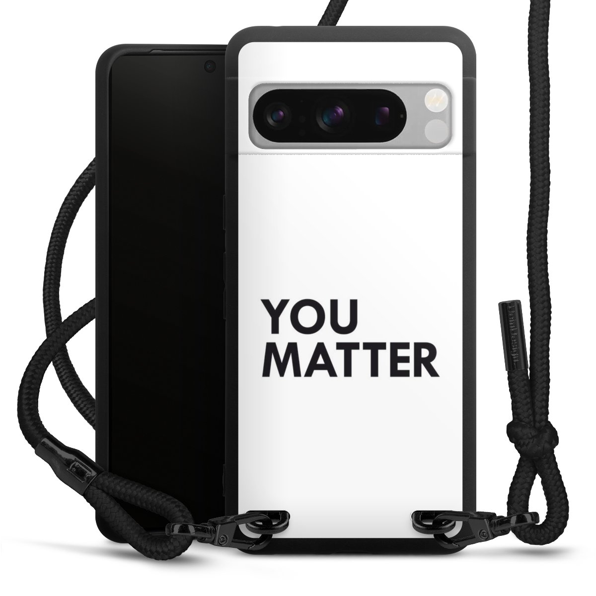 The matt black silicone case is made of flexible TPU (thermoplastic polyurethane) and offers robust protection. The durable, unbreakable material makes the cover flexible and dimensionally stable at the same time. The matte surface makes your design stand out more and is less susceptible to fingerprints and dirt. The stylish trend accessory fits comfortably in the hand and is perfectly complemented by the fabric (polyester) mobile phone strap. The braided fabric strap is approx. 1.70 metres long with a diameter of approx. 0.5 cm. Due to the special knotting technique, the length of the strap can be adjusted by simply pulling it, so that you can adapt it individually to your wishes. The practical case to wear around your neck is available with the fabric strap in black. As a little icing on the cake, we have provided the strap with a chic metal fastener in matt black. The strap is securely fastened to the case with loops made of high-quality genuine leather and press studs. The ends of the fabric strap are covered with metallic end caps and thus protected from fraying.