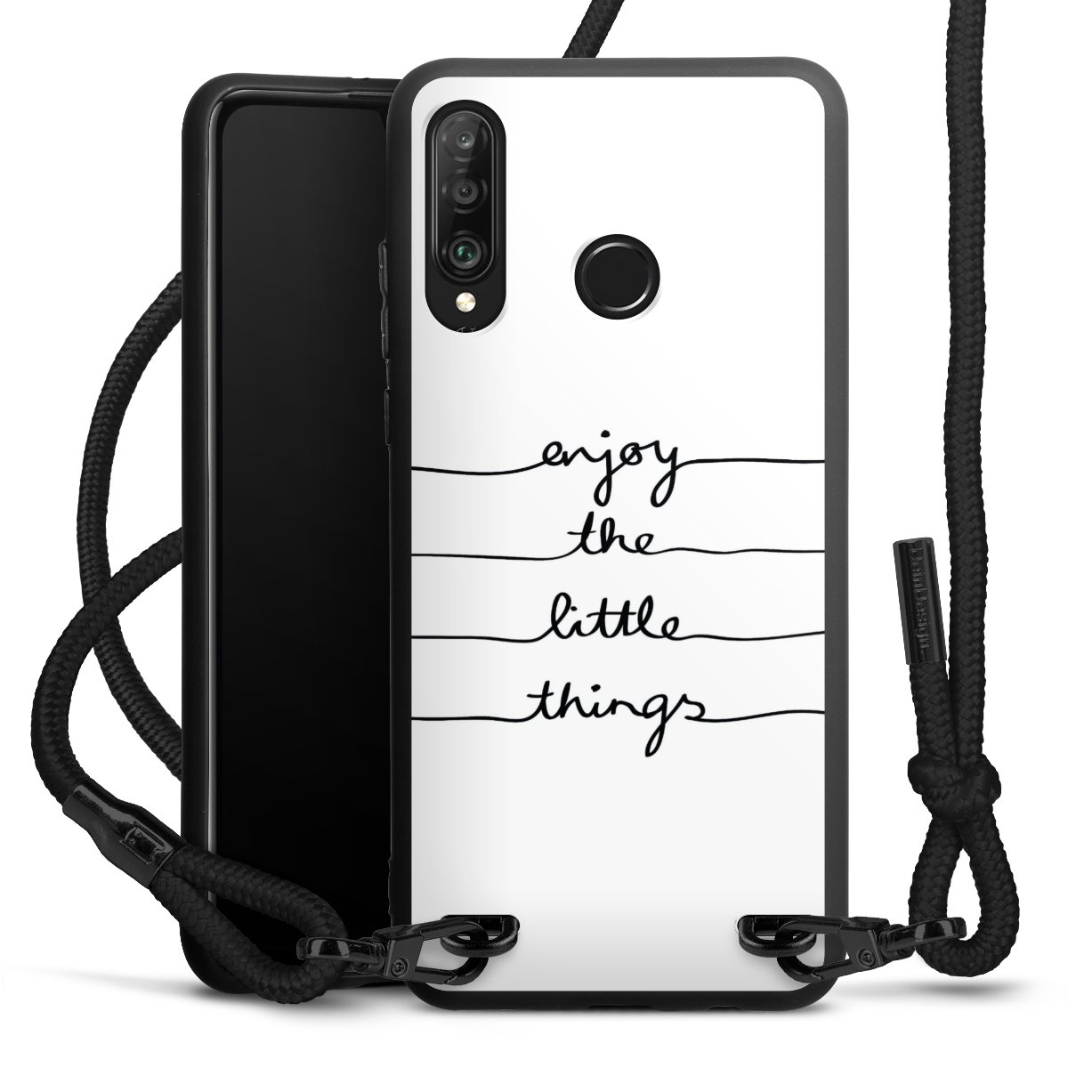 The matt black silicone case is made of flexible TPU (thermoplastic polyurethane) and offers robust protection. The durable, unbreakable material makes the cover flexible and dimensionally stable at the same time. The matte surface makes your design stand out more and is less susceptible to fingerprints and dirt. The stylish trend accessory fits comfortably in the hand and is perfectly complemented by the fabric (polyester) mobile phone strap. The braided fabric strap is approx. 1.70 metres long with a diameter of approx. 0.5 cm. Due to the special knotting technique, the length of the strap can be adjusted by simply pulling it, so that you can adapt it individually to your wishes. The practical case to wear around your neck is available with the fabric strap in black. As a little icing on the cake, we have provided the strap with a chic metal fastener in matt black. The strap is securely fastened to the case with loops made of high-quality genuine leather and press studs. The ends of the fabric strap are covered with metallic end caps and thus protected from fraying.