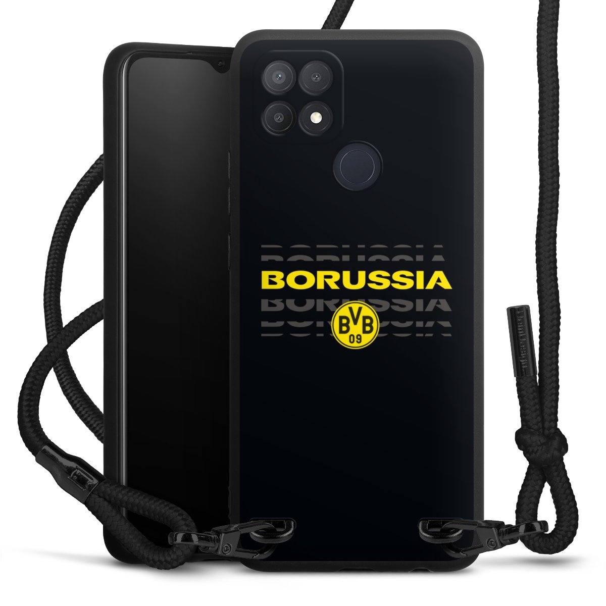 The matt black silicone case is made of flexible TPU (thermoplastic polyurethane) and offers robust protection. The durable, unbreakable material makes the cover flexible and dimensionally stable at the same time. The matte surface makes your design stand out more and is less susceptible to fingerprints and dirt. The stylish trend accessory fits comfortably in the hand and is perfectly complemented by the fabric (polyester) mobile phone strap. The braided fabric strap is approx. 1.70 metres long with a diameter of approx. 0.5 cm. Due to the special knotting technique, the length of the strap can be adjusted by simply pulling it, so that you can adapt it individually to your wishes. The practical case to wear around your neck is available with the fabric strap in black. As a little icing on the cake, we have provided the strap with a chic metal fastener in matt black. The strap is securely fastened to the case with loops made of high-quality genuine leather and press studs. The ends of the fabric strap are covered with metallic end caps and thus protected from fraying.