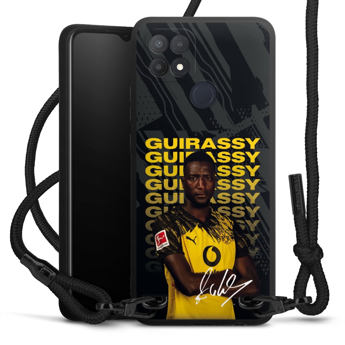 The matt black silicone case is made of flexible TPU (thermoplastic polyurethane) and offers robust protection. The durable, unbreakable material makes the cover flexible and dimensionally stable at the same time. The matte surface makes your design stand out more and is less susceptible to fingerprints and dirt. The stylish trend accessory fits comfortably in the hand and is perfectly complemented by the fabric (polyester) mobile phone strap. The braided fabric strap is approx. 1.70 metres long with a diameter of approx. 0.5 cm. Due to the special knotting technique, the length of the strap can be adjusted by simply pulling it, so that you can adapt it individually to your wishes. The practical case to wear around your neck is available with the fabric strap in black. As a little icing on the cake, we have provided the strap with a chic metal fastener in matt black. The strap is securely fastened to the case with loops made of high-quality genuine leather and press studs. The ends of the fabric strap are covered with metallic end caps and thus protected from fraying.